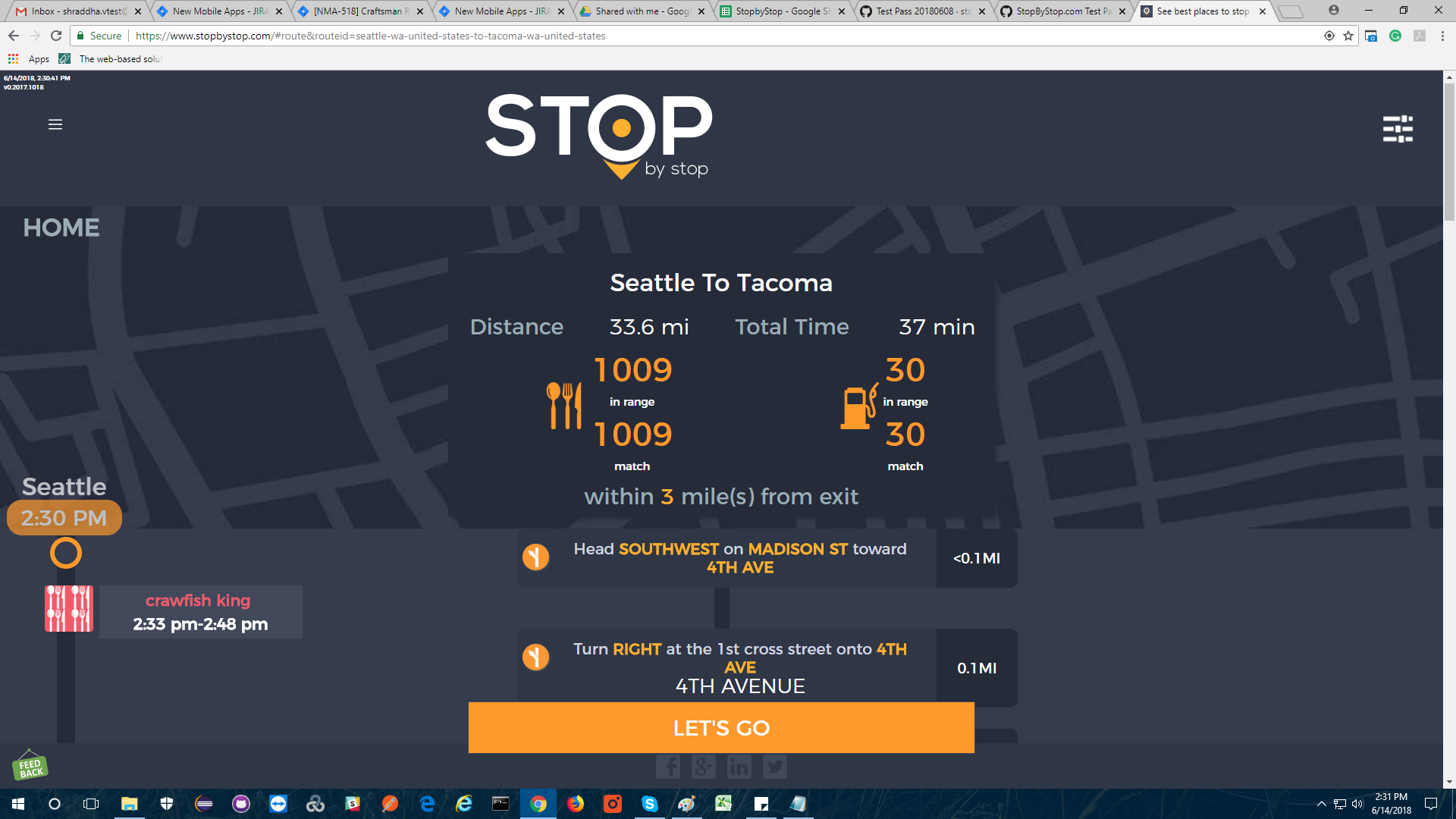 8. POISelectionGoToRoute. A. In the new browser tab open Seattle to Tacoma route. Click on first exit in the road line. Exit page should open. B. On the exit page click on the any item. POI page should open. </br/>C. On the POI page click Add to route button. POI selection popup should open. D. Click Add to route. Route page should open. E. On the sidebar there should be an icon to indicate the the place you picked. F. Click on Let's go button at the bottom of the screen. Google maps should open. Take a screenshot. |