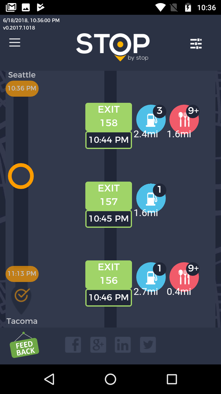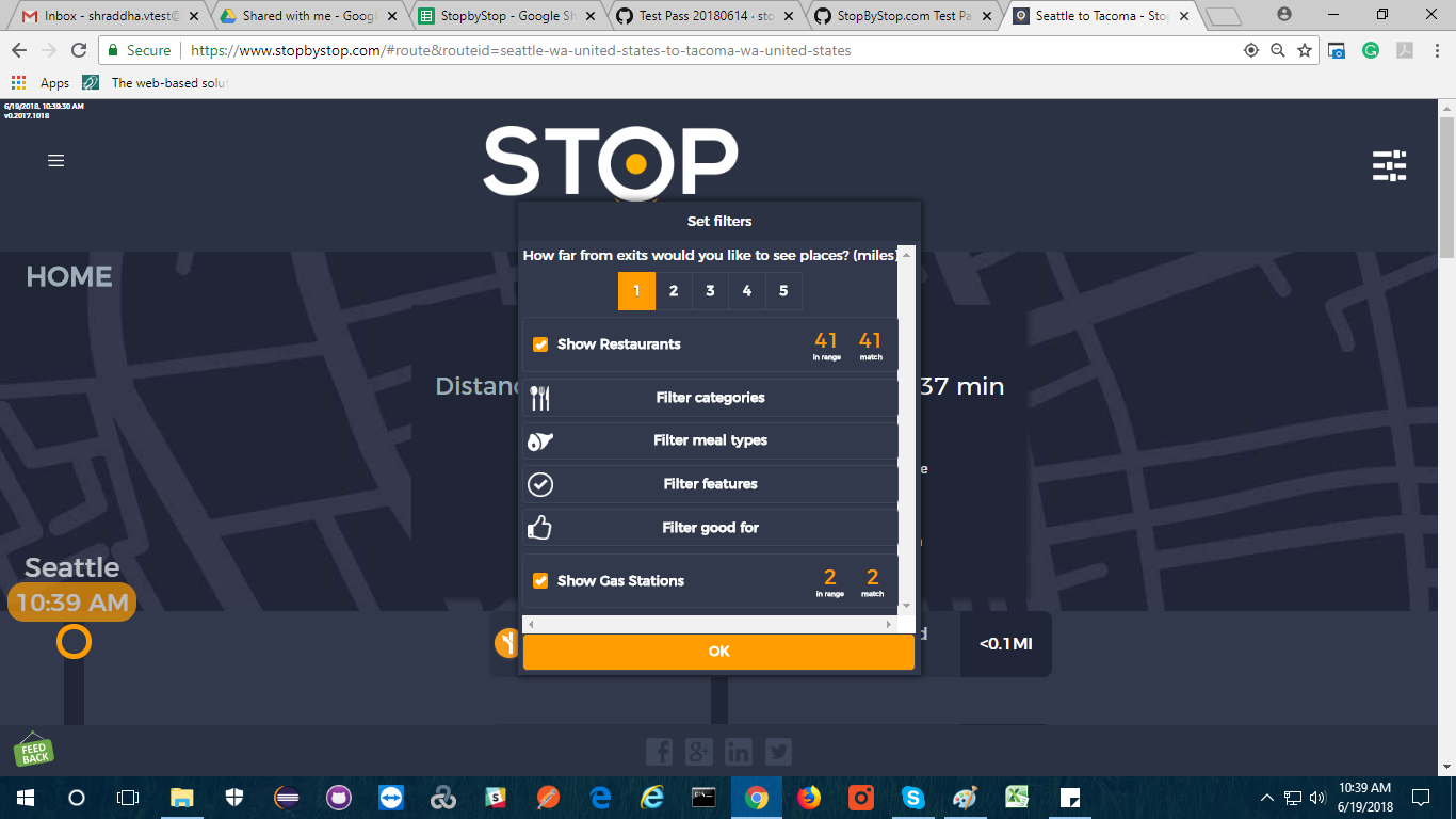 5. FiltersDistancePropagateToExit. A. Open Seattle to Tacoma route. B. Click on Filters and select 1 mile from exit. C. Close Filters popup and navigate to exit page. D. On the exit page open Filters popup and verify that distance settings (1 mile from exit) from route page are propagated. E. Take screenshot. |