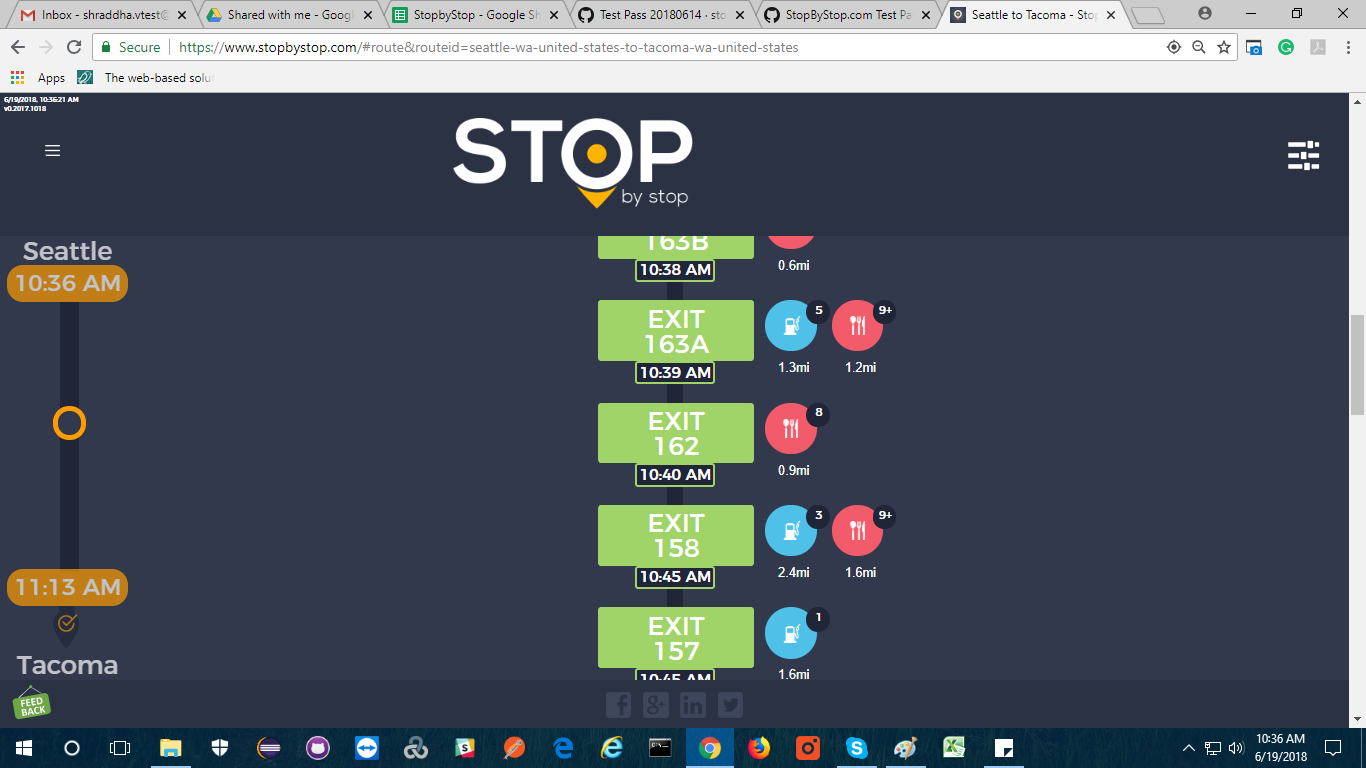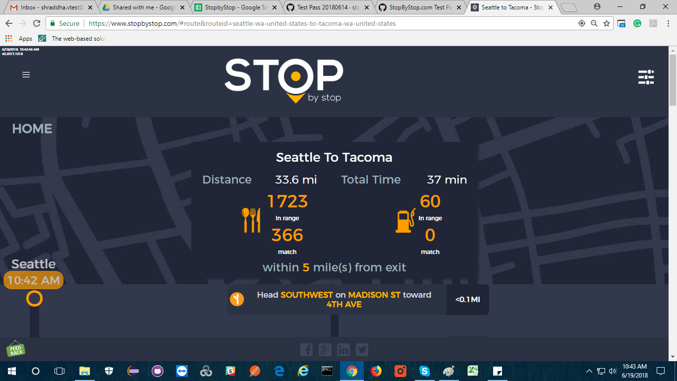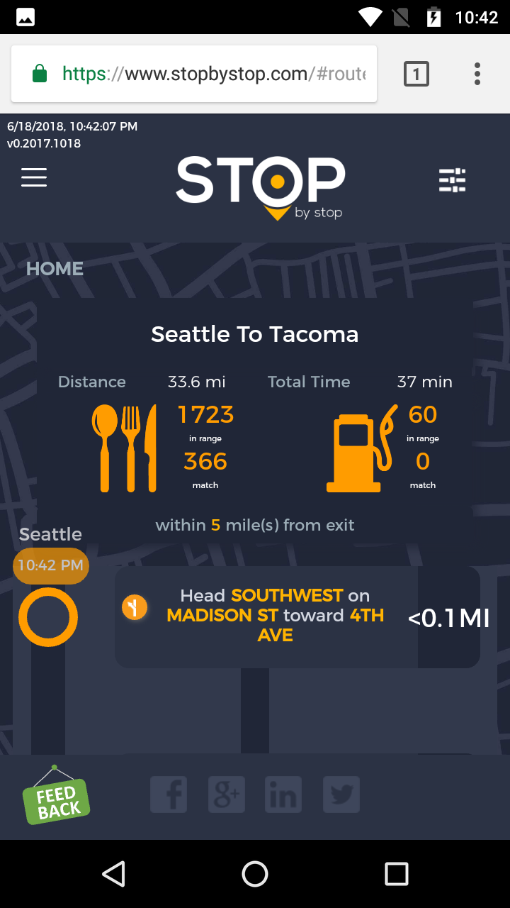 2. RoutePageRefesh. A. Navigate to test_server/ B. Type seat in the first textbox and pick Seattle from the dropdown. C. Type tac in the second textbox and pick Tacoma from the dropdown. D. Click View my trip. E. Route page should open showing exits with restaurants and gas station icons. F. Refresh the browser. Route page should open, NOT home page. Take screenshot. |