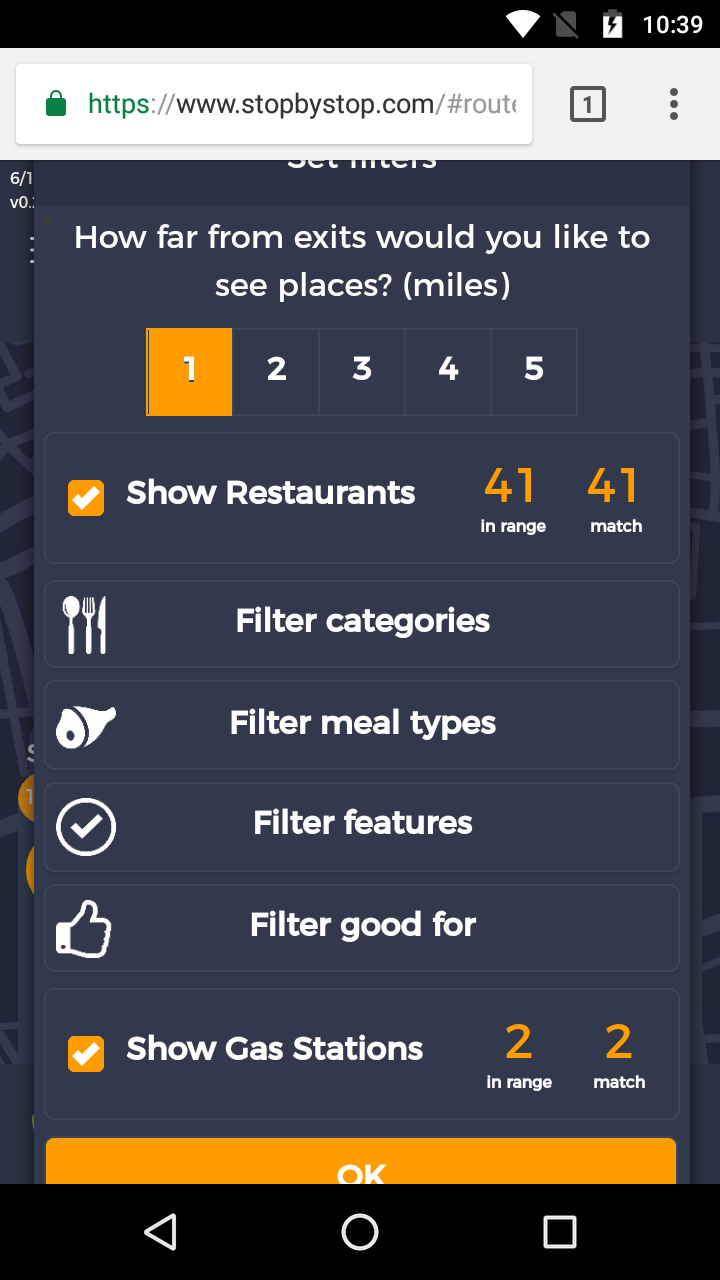 6. FiltersCategories. A. Navigate to test_server/route/47.68950,-122.03859-to-tacoma-wa-united-states. B. Click on Filters. C. Pick 5 miles from exit D. Unselect gas stations E. Leave restaurants selected. F. Click Filter categories select clear all, then select American(traditional) only. G. Click OK to close Filters. Take screenshot. |