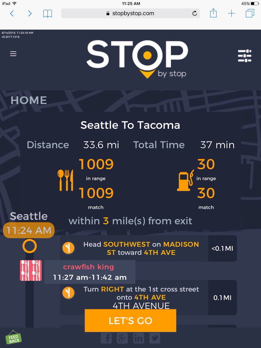8. POISelectionGoToRoute. A. In the new browser tab open Seattle to Tacoma route. Click on first exit in the road line. Exit page should open. B. On the exit page click on the any item. POI page should open. </br/>C. On the POI page click Add to route button. POI selection popup should open. D. Click Add to route. Route page should open. E. On the sidebar there should be an icon to indicate the the place you picked. F. Click on Let's go button at the bottom of the screen. Google maps should open. Take a screenshot. |