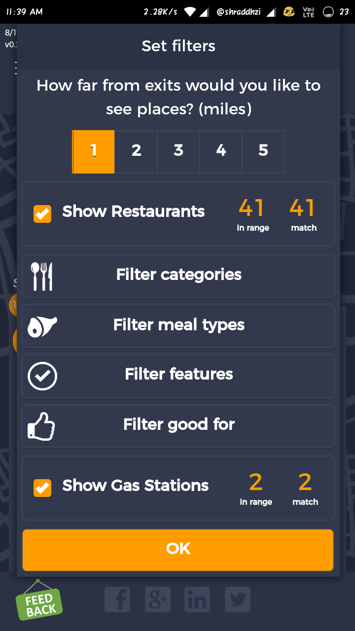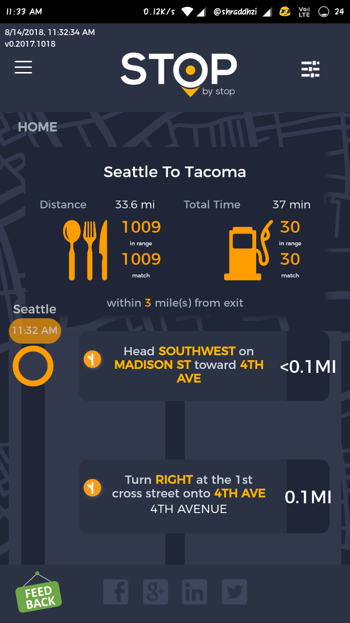 5. FiltersDistancePropagateToExit. A. Open Seattle to Tacoma route. B. Click on Filters and select 1 mile from exit. C. Close Filters popup and navigate to exit page. D. On the exit page open Filters popup and verify that distance settings (1 mile from exit) from route page are propagated. E. Take screenshot. |