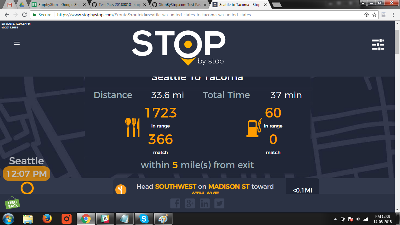 2. RoutePageRefesh. A. Navigate to test_server/ B. Type seat in the first textbox and pick Seattle from the dropdown. C. Type tac in the second textbox and pick Tacoma from the dropdown. D. Click View my trip. E. Route page should open showing exits with restaurants and gas station icons. F. Refresh the browser. Route page should open, NOT home page. Take screenshot. |