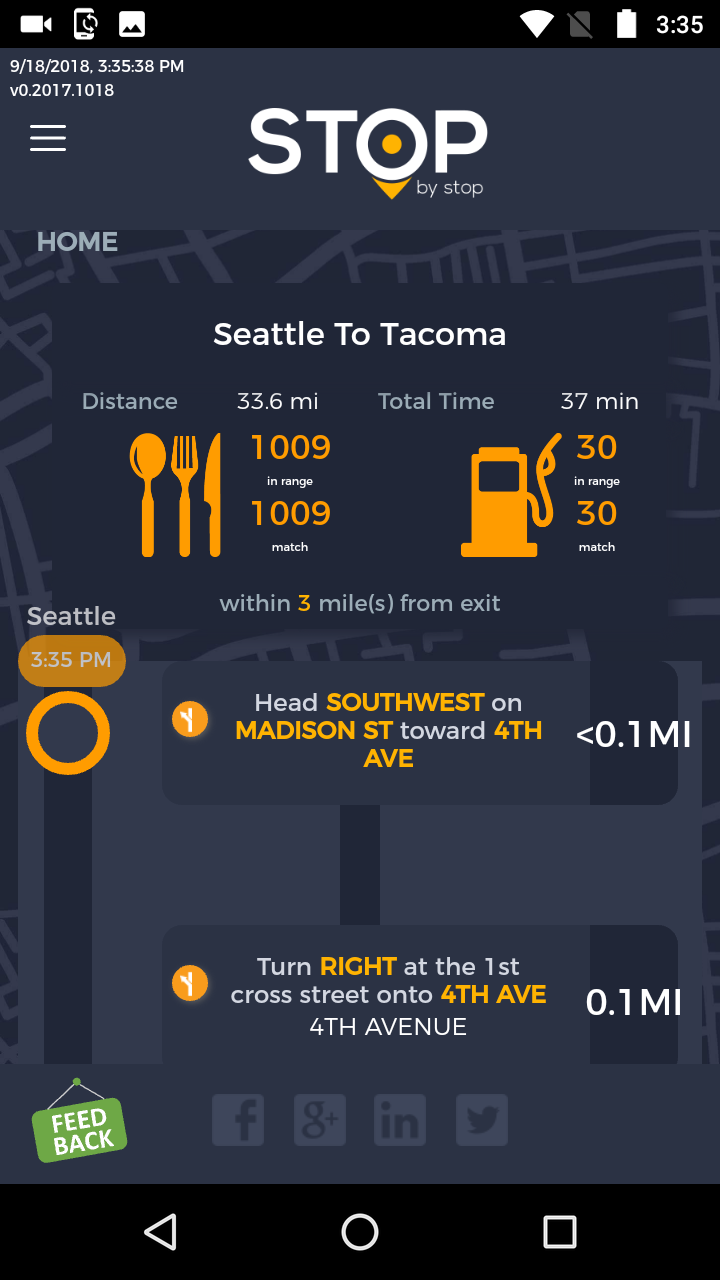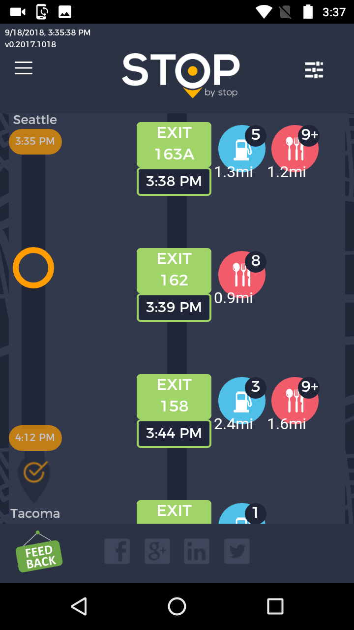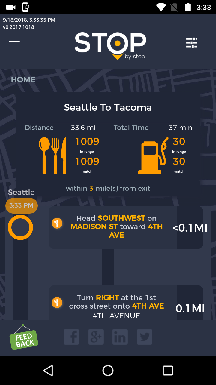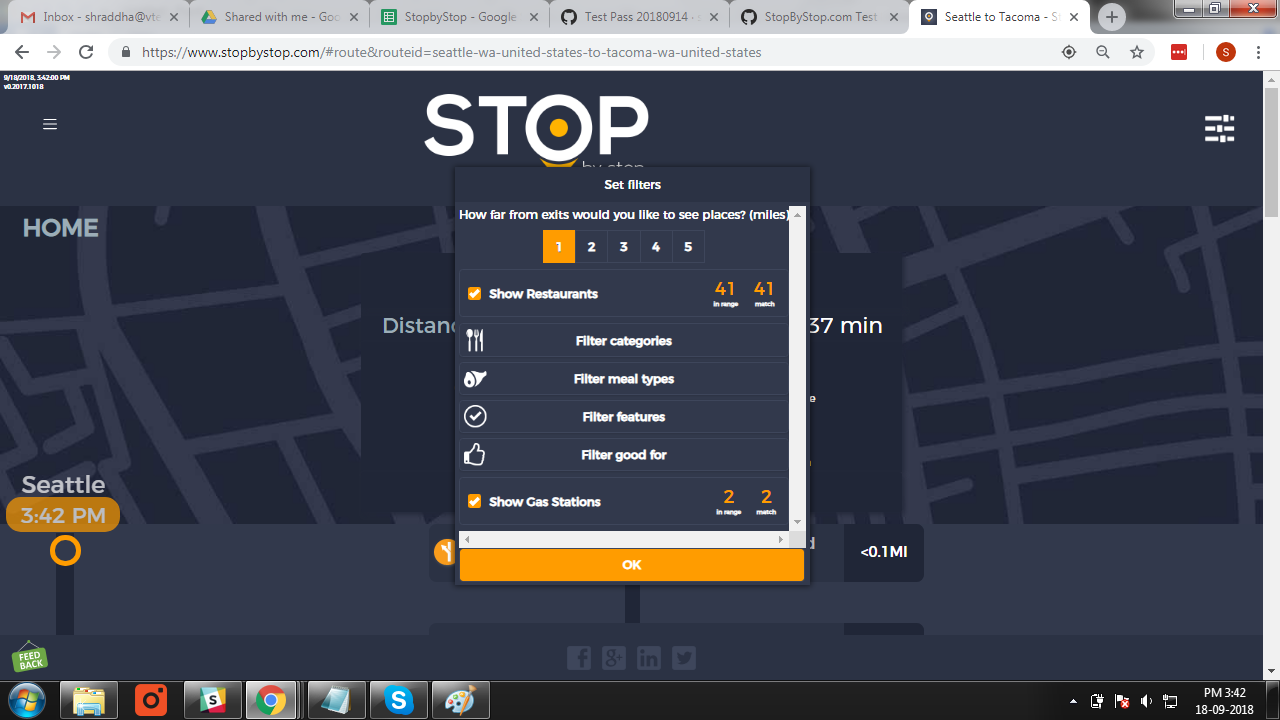 5. FiltersDistancePropagateToExit. A. Open Seattle to Tacoma route. B. Click on Filters and select 1 mile from exit. C. Close Filters popup and navigate to exit page. D. On the exit page open Filters popup and verify that distance settings (1 mile from exit) from route page are propagated. E. Take screenshot. |
