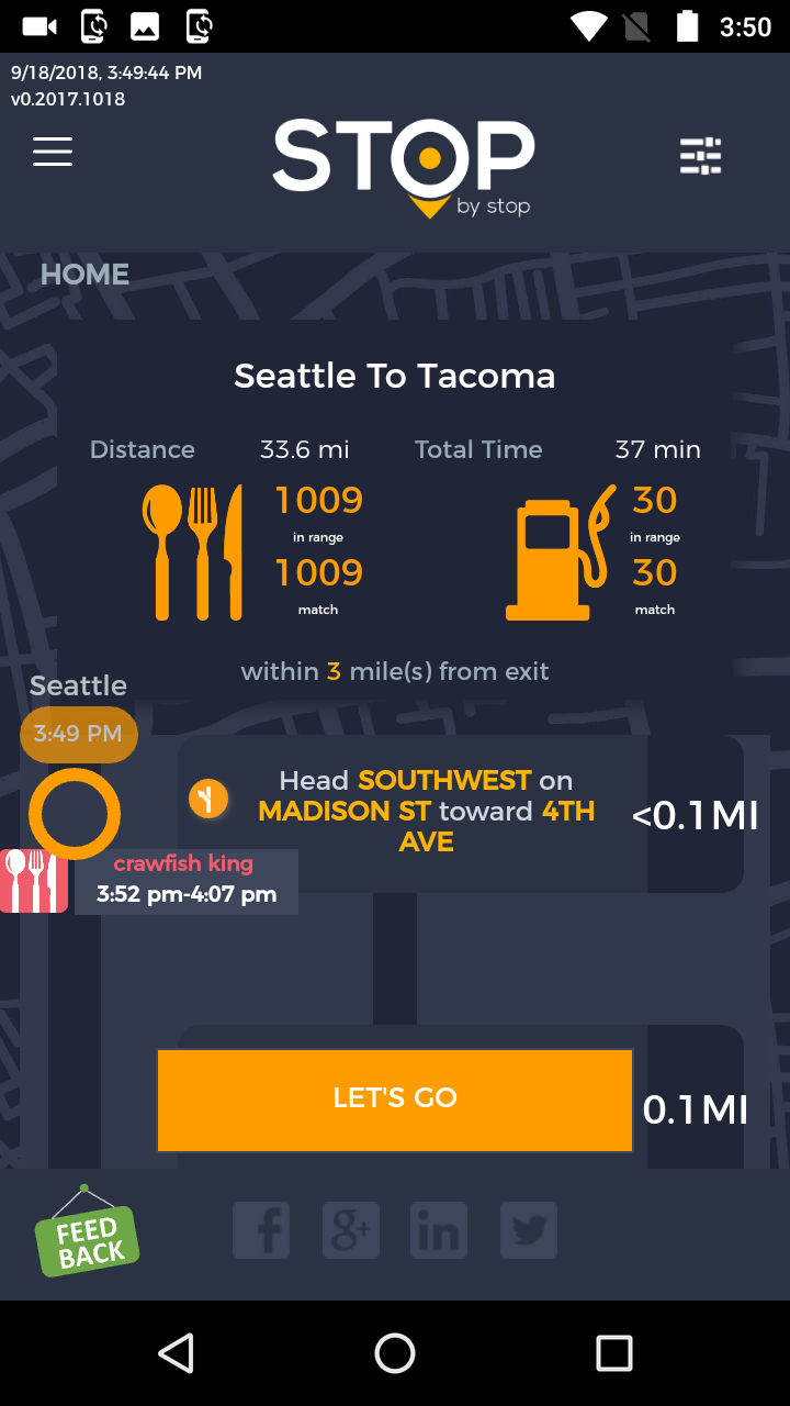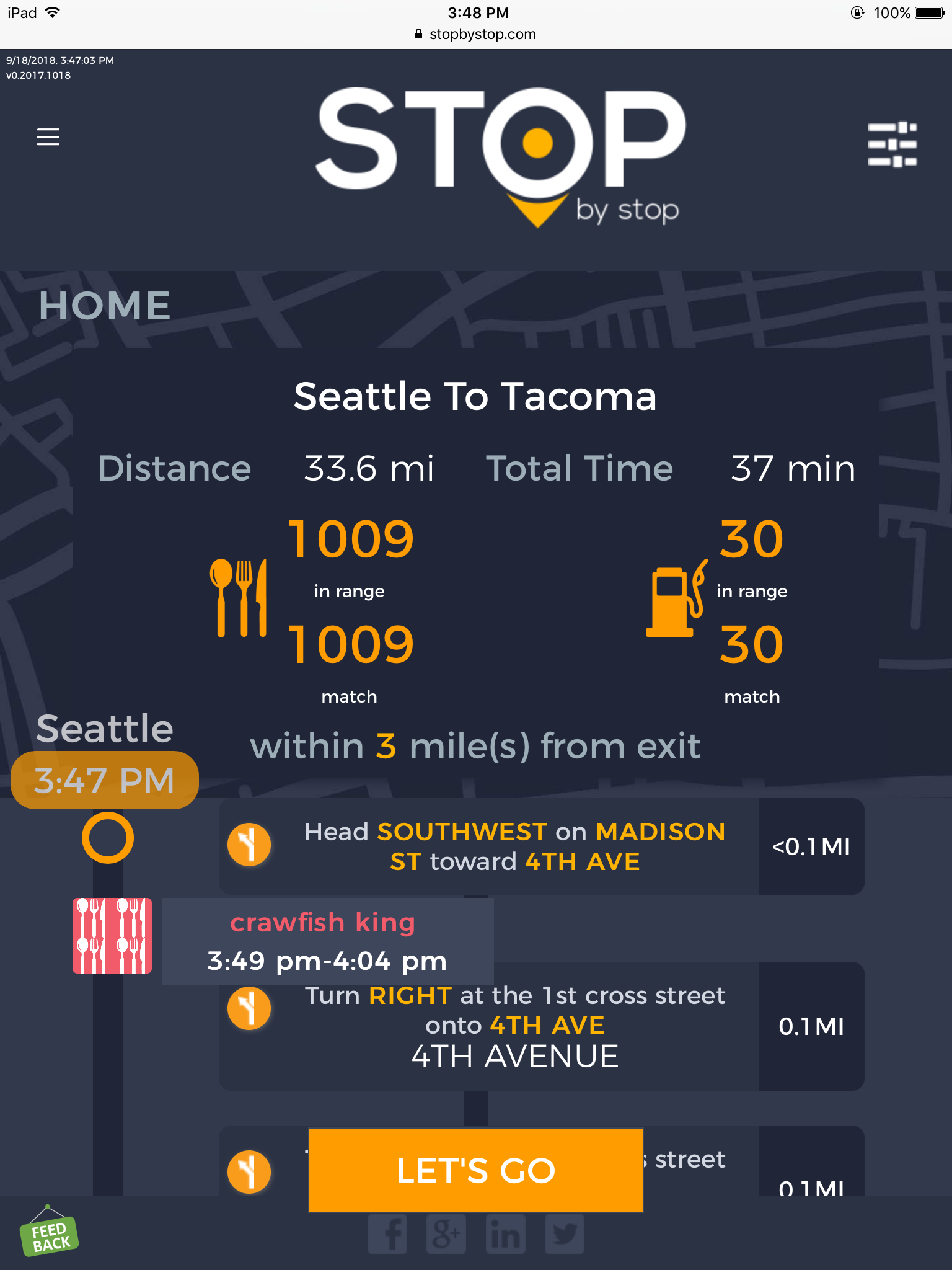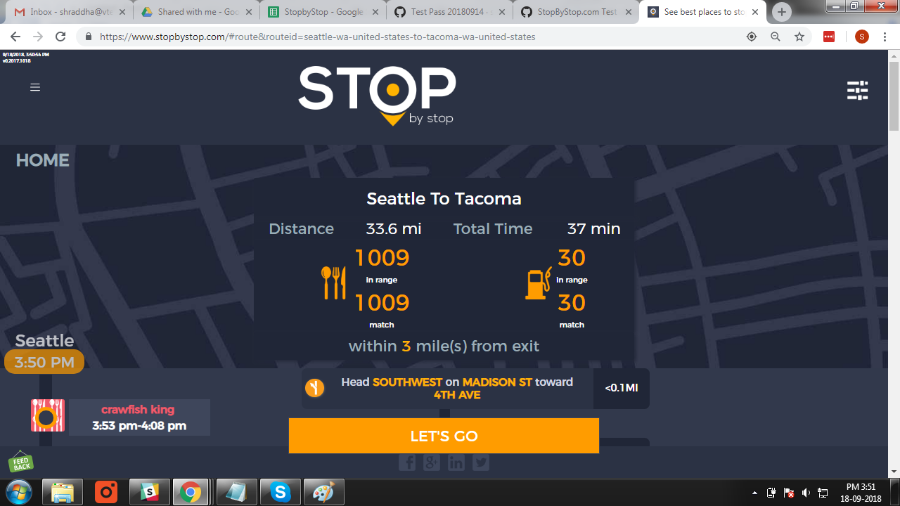 8. POISelectionGoToRoute. A. In the new browser tab open Seattle to Tacoma route. Click on first exit in the road line. Exit page should open. B. On the exit page click on the any item. POI page should open. </br/>C. On the POI page click Add to route button. POI selection popup should open. D. Click Add to route. Route page should open. E. On the sidebar there should be an icon to indicate the the place you picked. F. Click on Let's go button at the bottom of the screen. Google maps should open. Take a screenshot. |