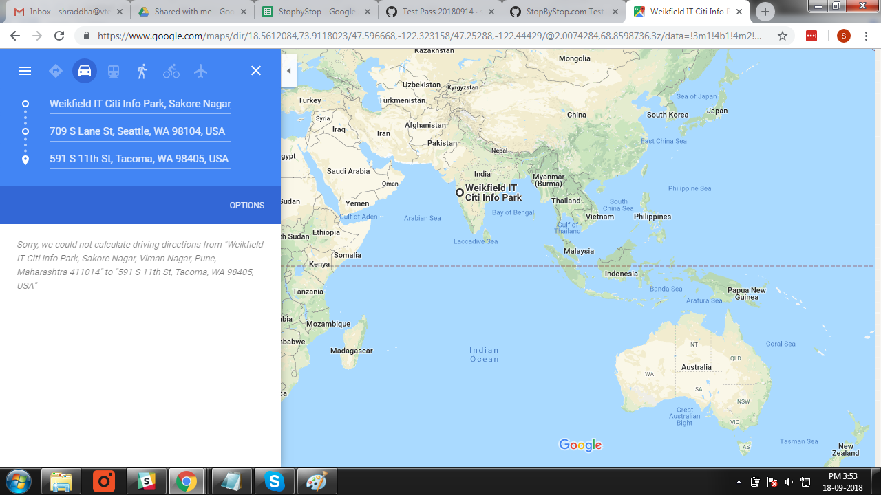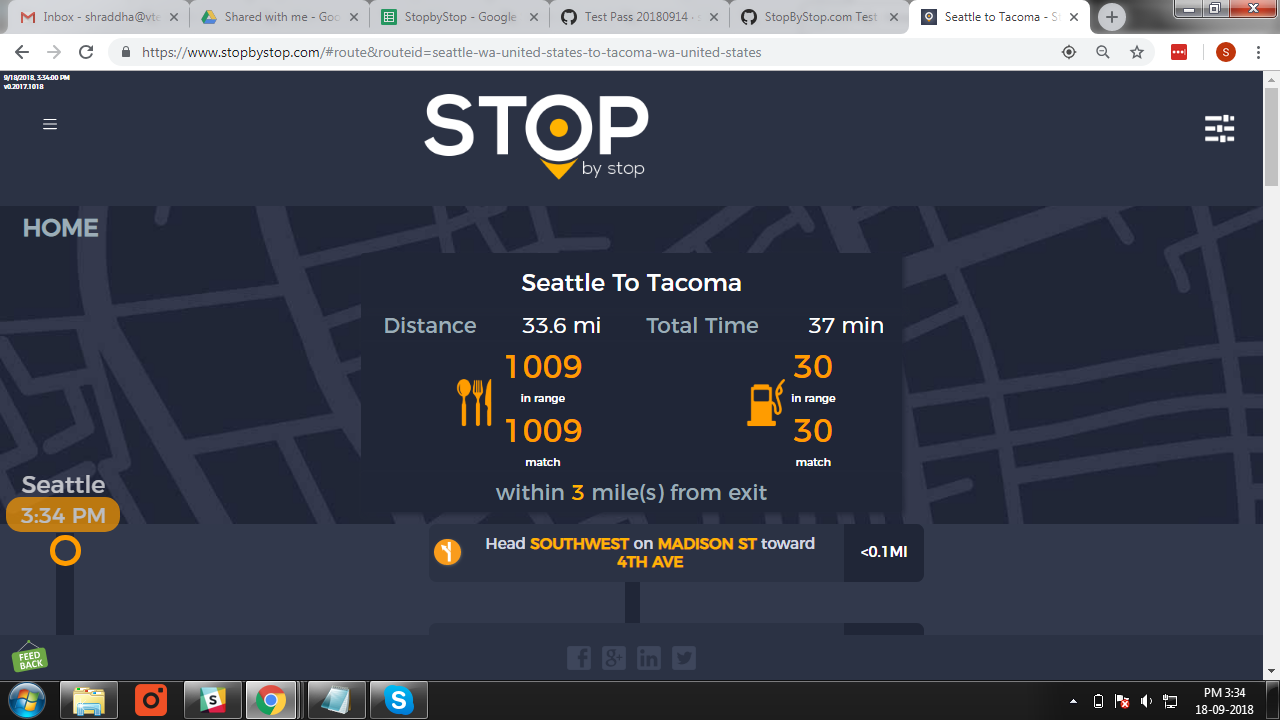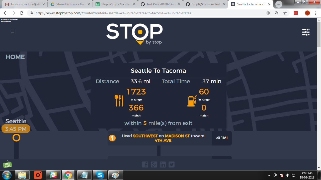 2. RoutePageRefesh. A. Navigate to test_server/ B. Type seat in the first textbox and pick Seattle from the dropdown. C. Type tac in the second textbox and pick Tacoma from the dropdown. D. Click View my trip. E. Route page should open showing exits with restaurants and gas station icons. F. Refresh the browser. Route page should open, NOT home page. Take screenshot. |