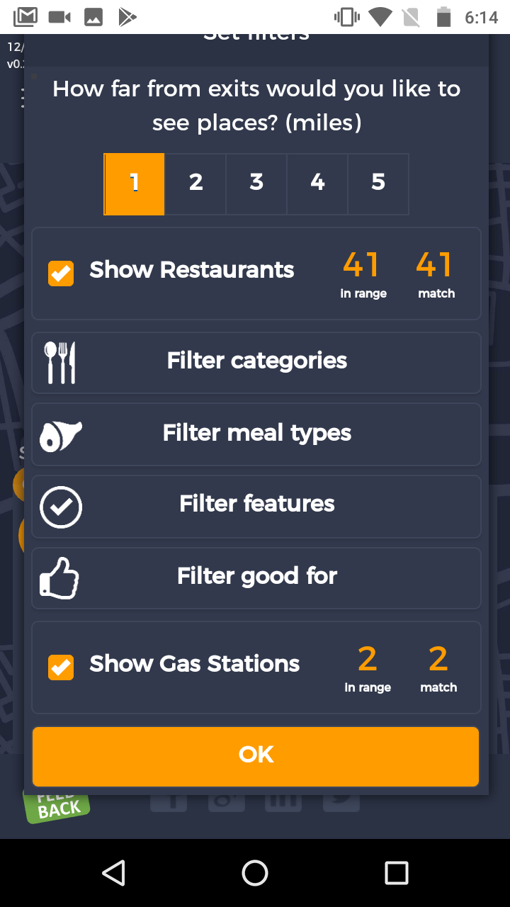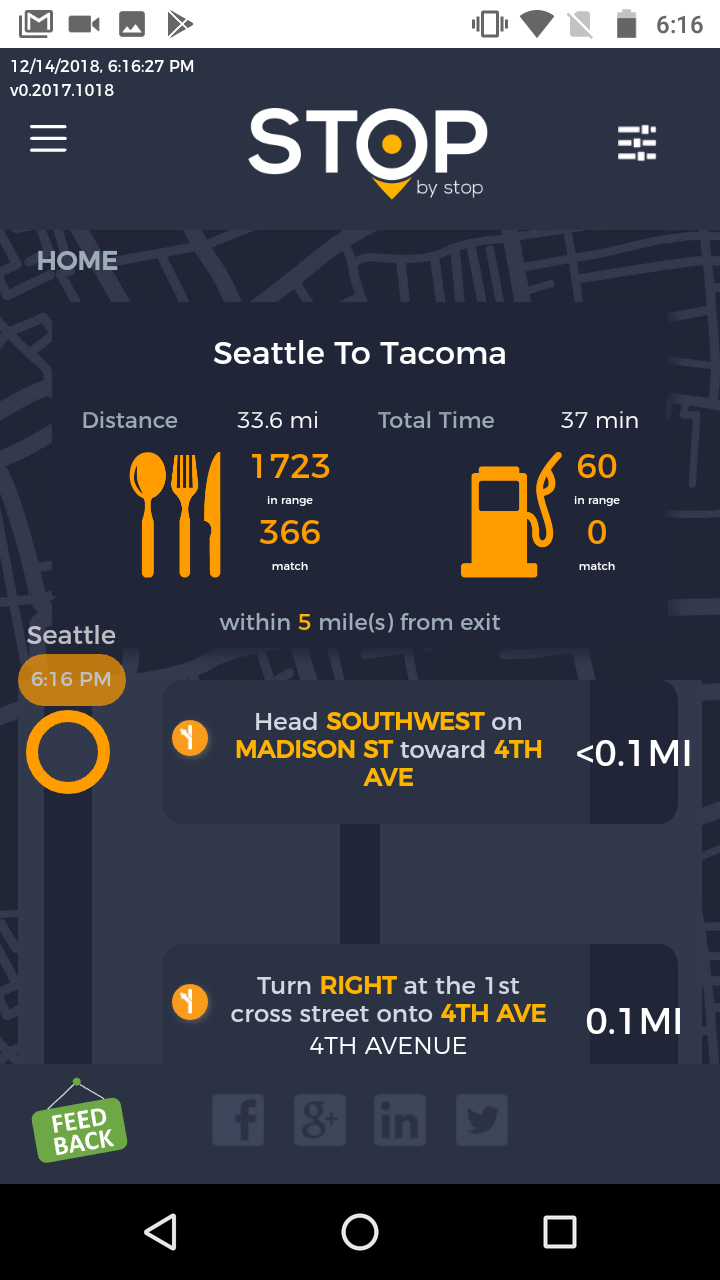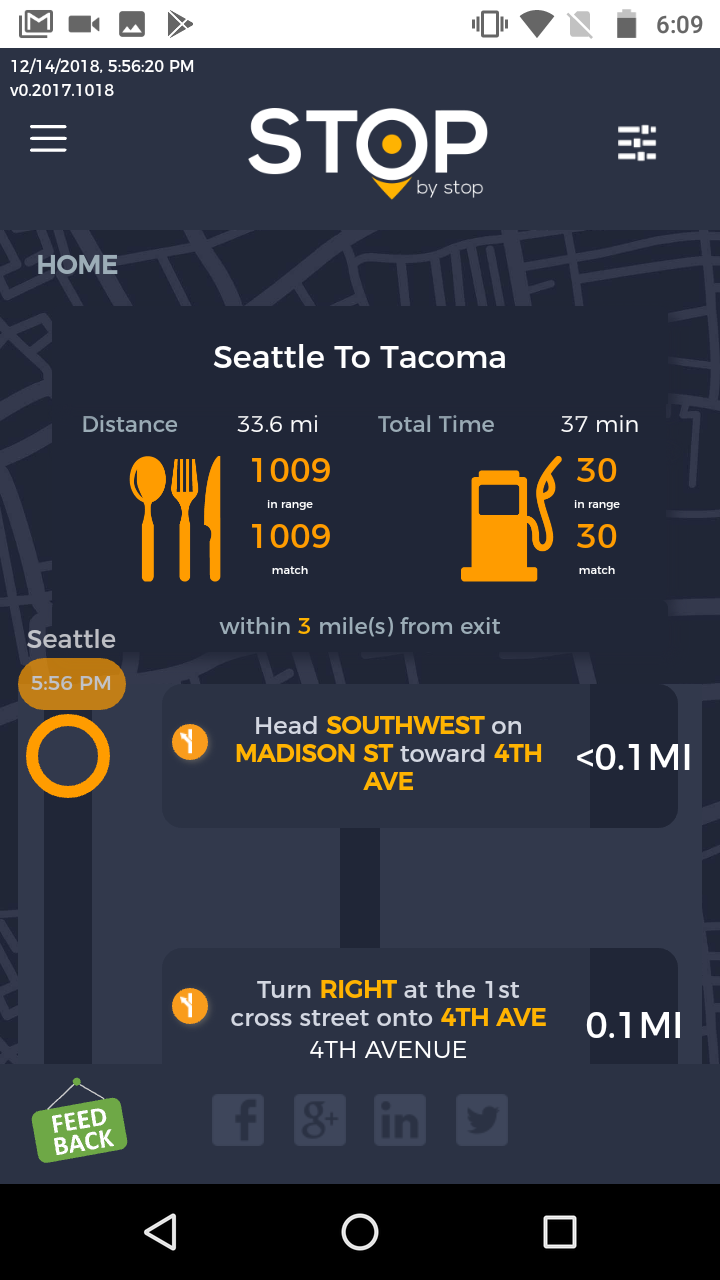 5. FiltersDistancePropagateToExit. A. Open Seattle to Tacoma route. B. Click on Filters and select 1 mile from exit. C. Close Filters popup and navigate to exit page. D. On the exit page open Filters popup and verify that distance settings (1 mile from exit) from route page are propagated. E. Take screenshot. |