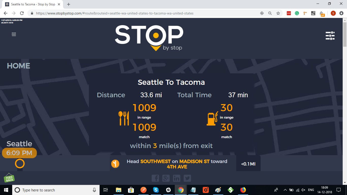 2. RoutePageRefesh. A. Navigate to test_server/ B. Type seat in the first textbox and pick Seattle from the dropdown. C. Type tac in the second textbox and pick Tacoma from the dropdown. D. Click View my trip. E. Route page should open showing exits with restaurants and gas station icons. F. Refresh the browser. Route page should open, NOT home page. Take screenshot. |