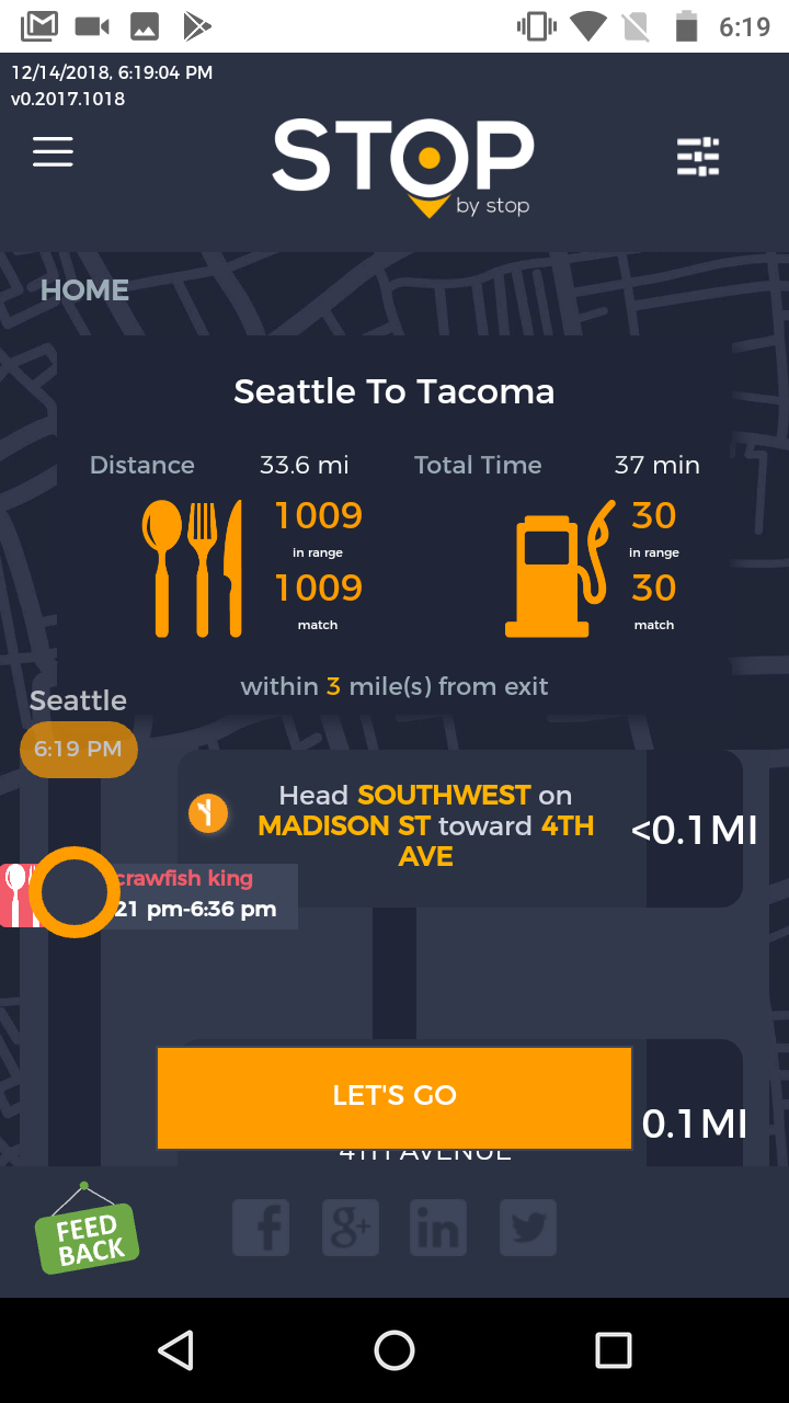 8. POISelectionGoToRoute. A. In the new browser tab open Seattle to Tacoma route. Click on first exit in the road line. Exit page should open. B. On the exit page click on the any item. POI page should open. </br/>C. On the POI page click Add to route button. POI selection popup should open. D. Click Add to route. Route page should open. E. On the sidebar there should be an icon to indicate the the place you picked. F. Click on Let's go button at the bottom of the screen. Google maps should open. Take a screenshot. |