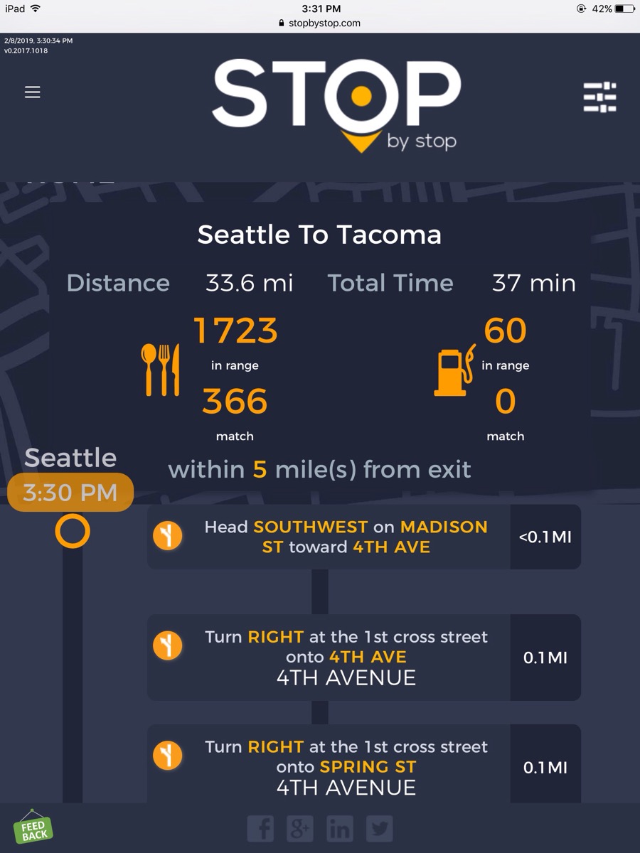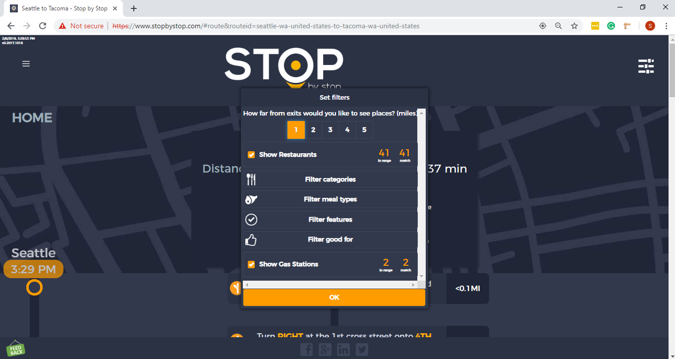 5. FiltersDistancePropagateToExit. A. Open Seattle to Tacoma route. B. Click on Filters and select 1 mile from exit. C. Close Filters popup and navigate to exit page. D. On the exit page open Filters popup and verify that distance settings (1 mile from exit) from route page are propagated. E. Take screenshot. |