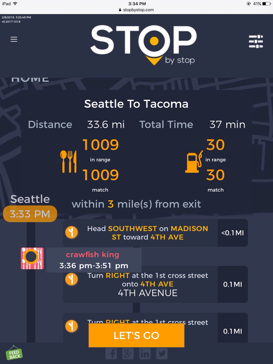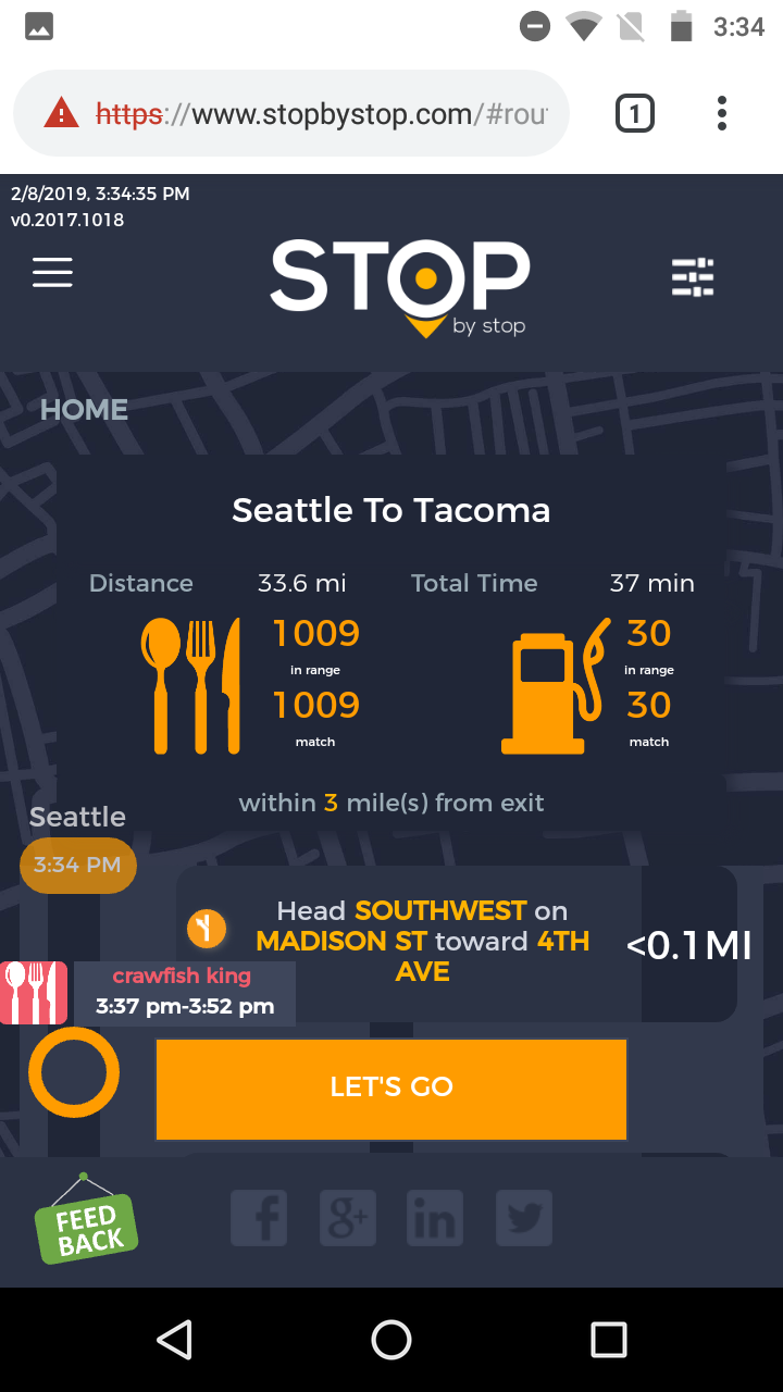 8. POISelectionGoToRoute. A. In the new browser tab open Seattle to Tacoma route. Click on first exit in the road line. Exit page should open. B. On the exit page click on the any item. POI page should open. </br/>C. On the POI page click Add to route button. POI selection popup should open. D. Click Add to route. Route page should open. E. On the sidebar there should be an icon to indicate the the place you picked. F. Click on Let's go button at the bottom of the screen. Google maps should open. Take a screenshot. |