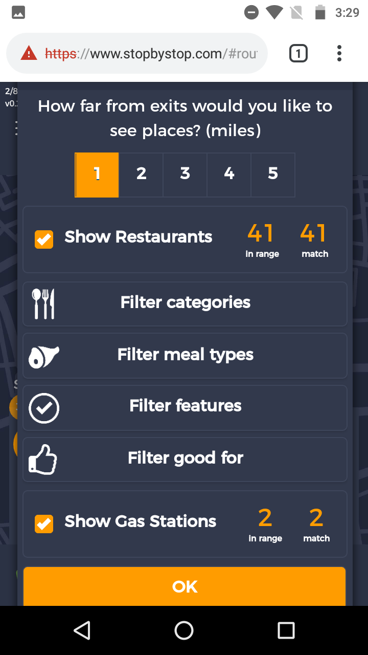 6. FiltersCategories. A. Navigate to test_server/route/47.68950,-122.03859-to-tacoma-wa-united-states. B. Click on Filters. C. Pick 5 miles from exit D. Unselect gas stations E. Leave restaurants selected. F. Click Filter categories select clear all, then select American(traditional) only. G. Click OK to close Filters. Take screenshot. |