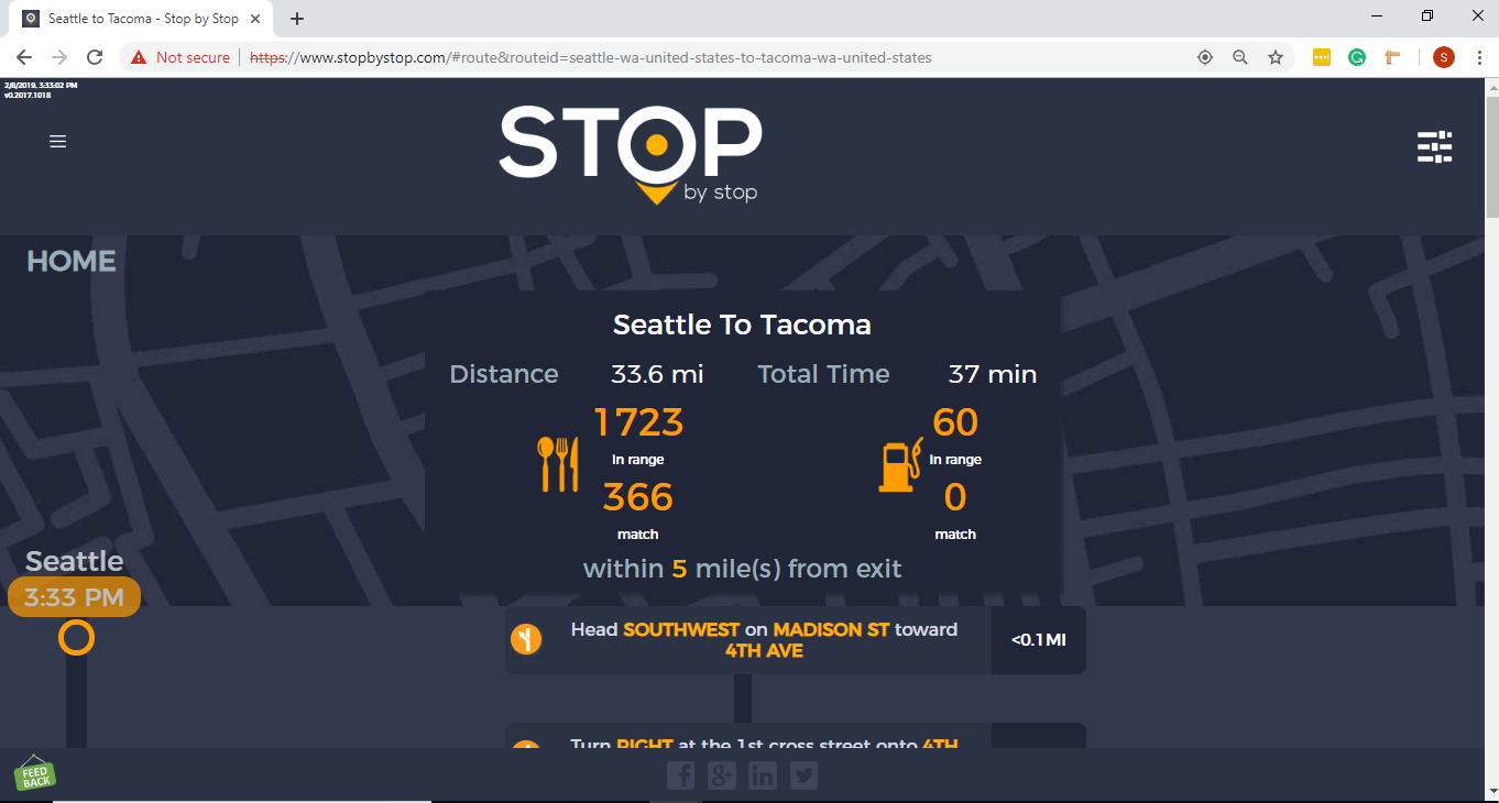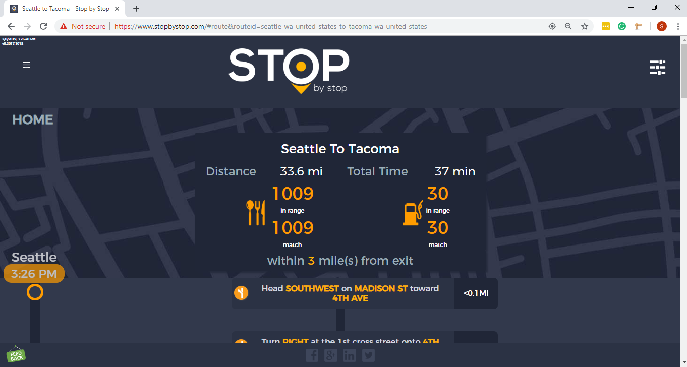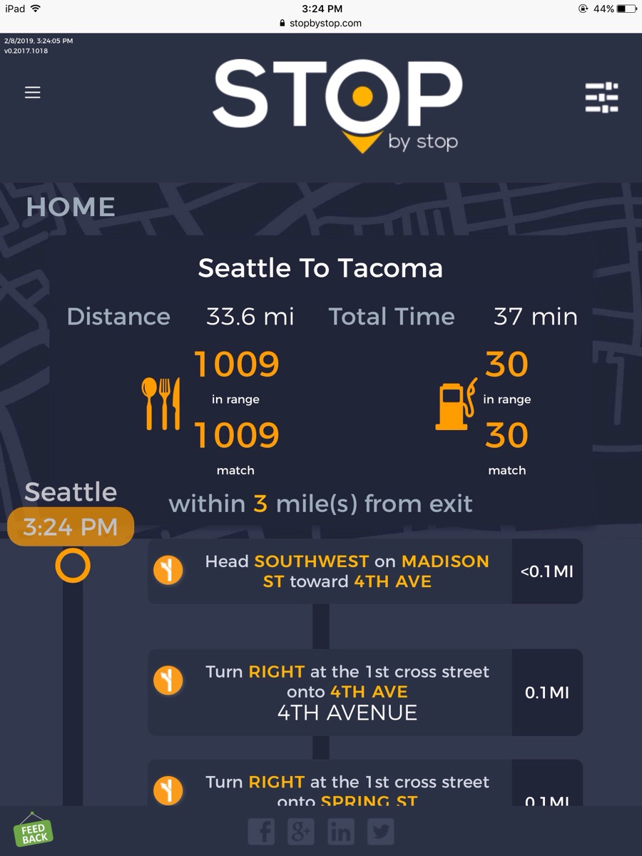 2. RoutePageRefesh. A. Navigate to test_server/ B. Type seat in the first textbox and pick Seattle from the dropdown. C. Type tac in the second textbox and pick Tacoma from the dropdown. D. Click View my trip. E. Route page should open showing exits with restaurants and gas station icons. F. Refresh the browser. Route page should open, NOT home page. Take screenshot. |
