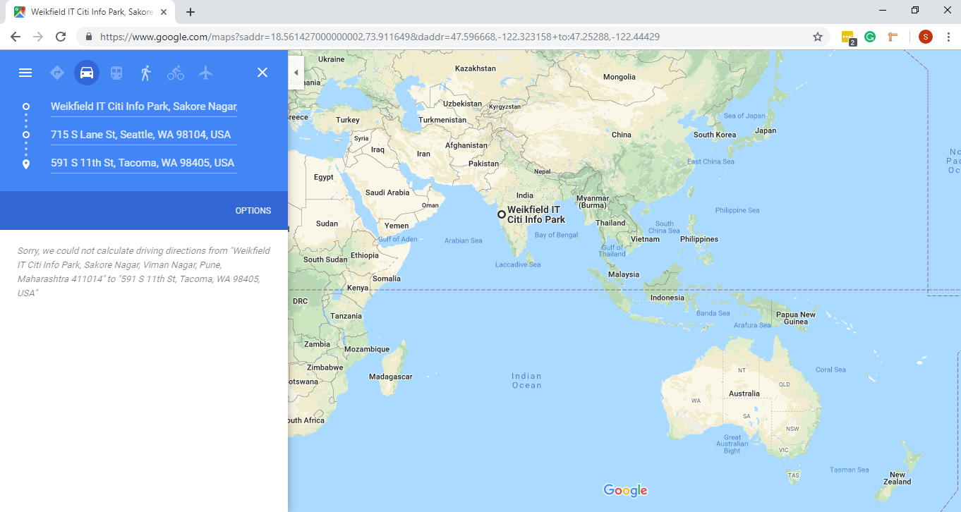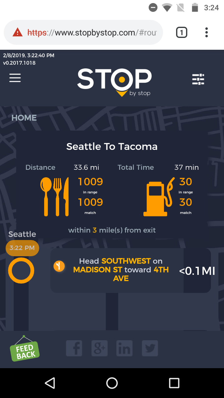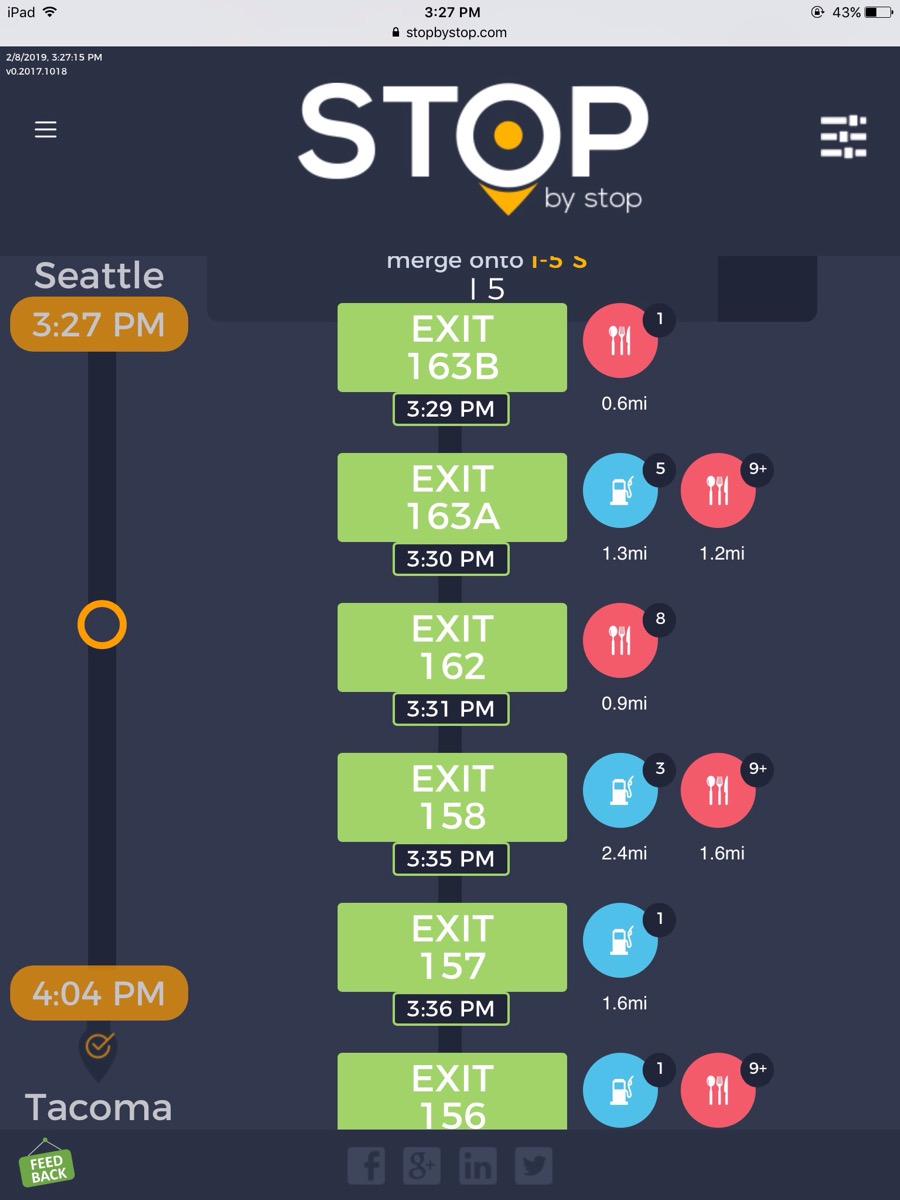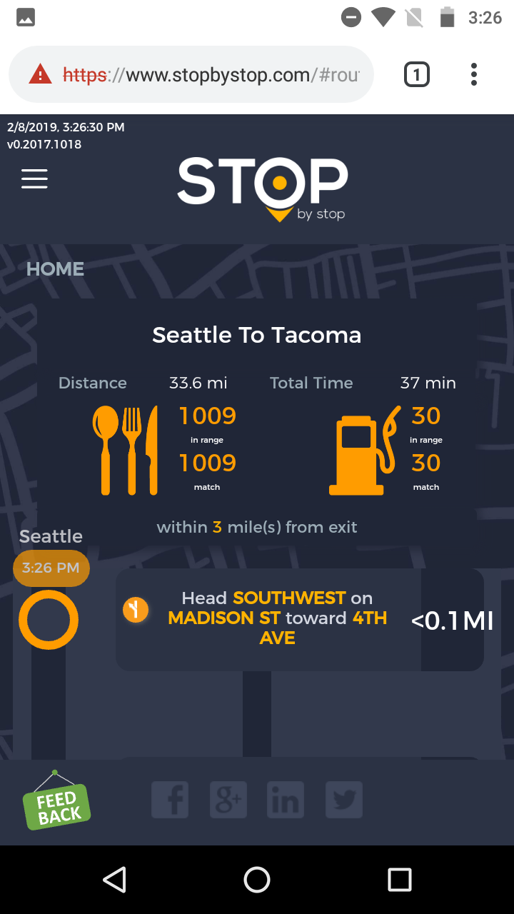 2. RoutePageRefesh. A. Navigate to test_server/ B. Type seat in the first textbox and pick Seattle from the dropdown. C. Type tac in the second textbox and pick Tacoma from the dropdown. D. Click View my trip. E. Route page should open showing exits with restaurants and gas station icons. F. Refresh the browser. Route page should open, NOT home page. Take screenshot. |