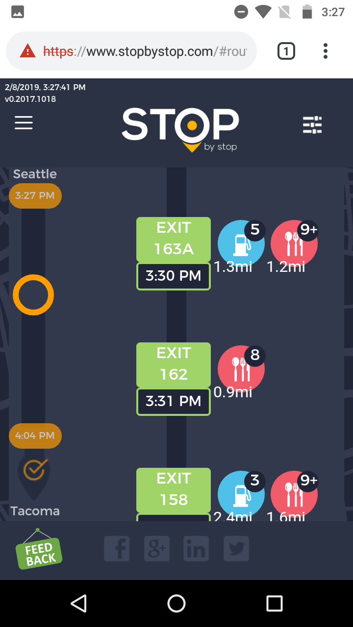 4. ExitPagesNavigation. A. Navigate to test_server/ B. Type Seattle to Tacoma route and navigate. C. Click on first exit. Verify that exit page opens and both - gas stations and restaurants are shown. Click back button in the browser to go back. D. Click on restaurant icon for the same exit and verify that same exit opens, but only restaurants are shown. Go back. E. Click on gas station icon for the same exit and verify that same exit opens, but only gas stations are shown. F. Verify that clicking on Phone icon opens Phone application. Some of the items (but not all of them) will have Yelp icon displayed next to them. Verify that clicking on Yelp icon navigates to Yelp website. Take a screenshot from Yelp website. |