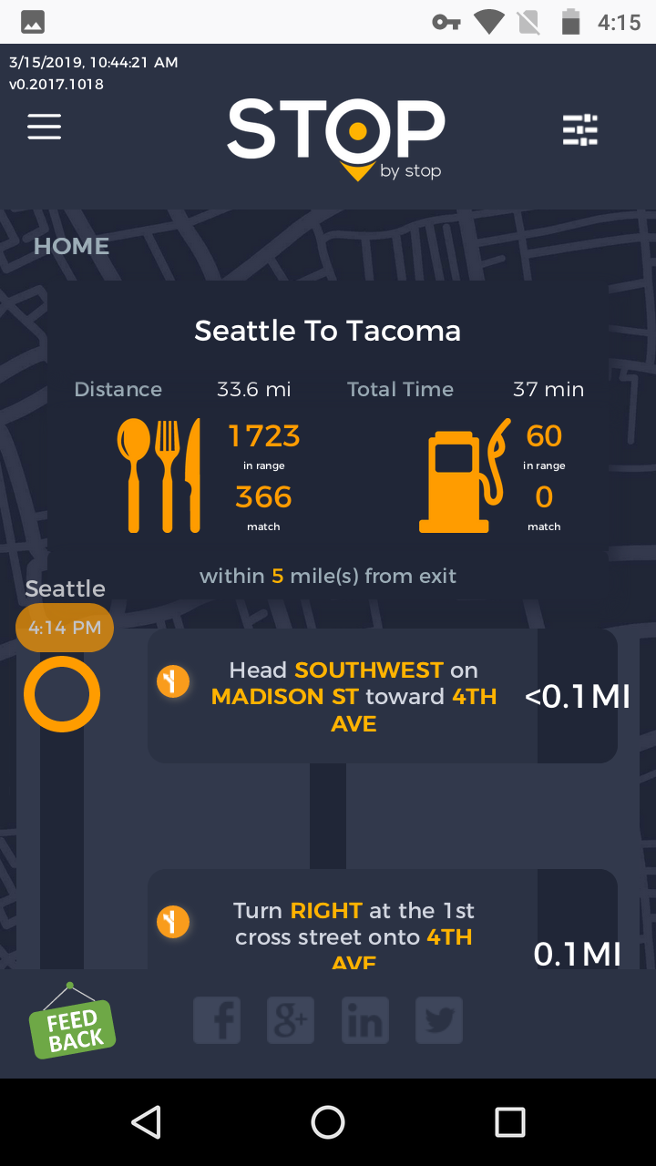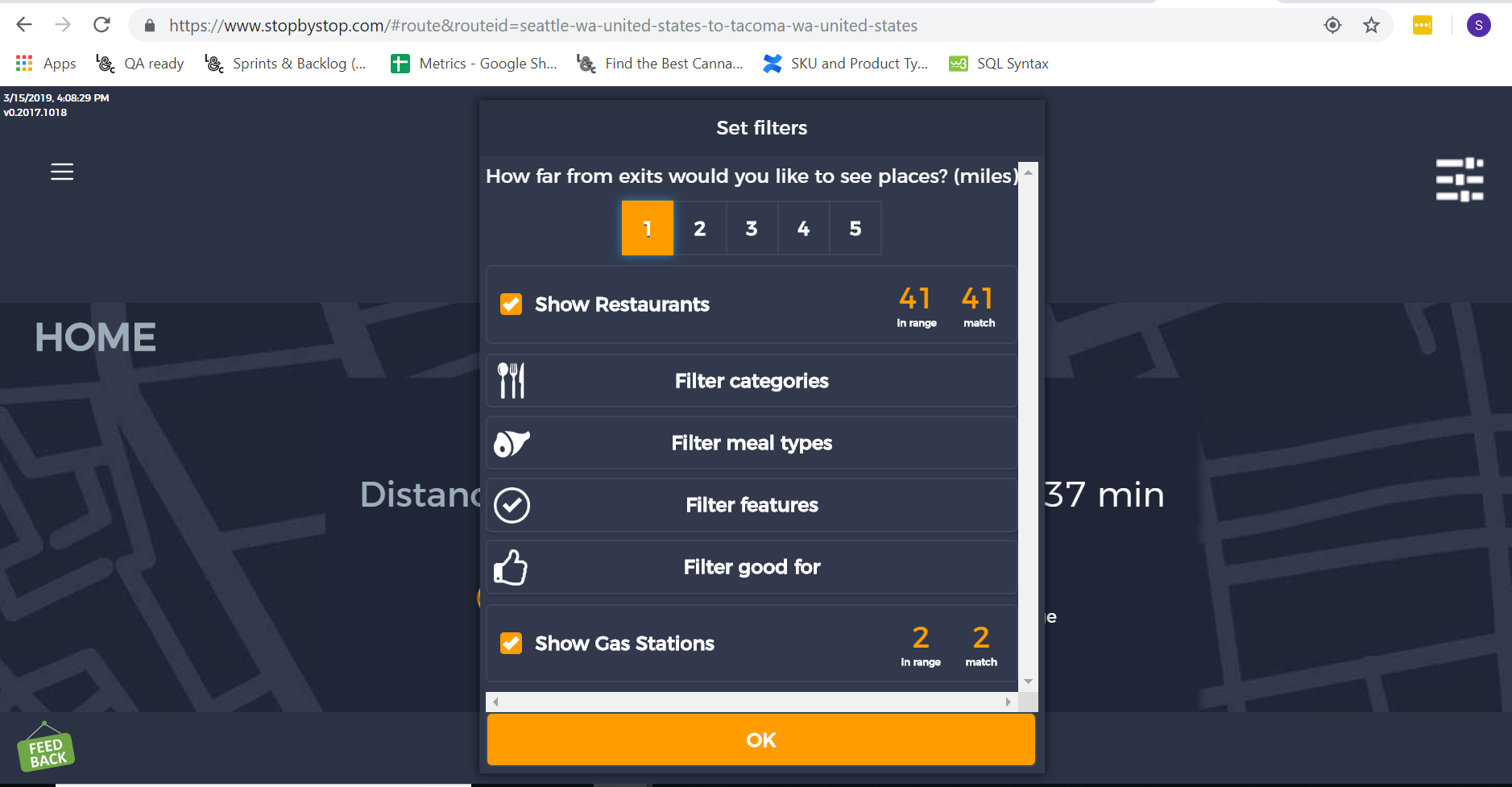 5. FiltersDistancePropagateToExit. A. Open Seattle to Tacoma route. B. Click on Filters and select 1 mile from exit. C. Close Filters popup and navigate to exit page. D. On the exit page open Filters popup and verify that distance settings (1 mile from exit) from route page are propagated. E. Take screenshot. |