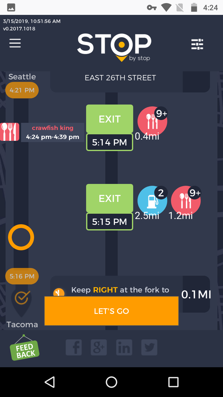 4. ExitPagesNavigation. A. Navigate to test_server/ B. Type Seattle to Tacoma route and navigate. C. Click on first exit. Verify that exit page opens and both - gas stations and restaurants are shown. Click back button in the browser to go back. D. Click on restaurant icon for the same exit and verify that same exit opens, but only restaurants are shown. Go back. E. Click on gas station icon for the same exit and verify that same exit opens, but only gas stations are shown. F. Verify that clicking on Phone icon opens Phone application. Some of the items (but not all of them) will have Yelp icon displayed next to them. Verify that clicking on Yelp icon navigates to Yelp website. Take a screenshot from Yelp website. |