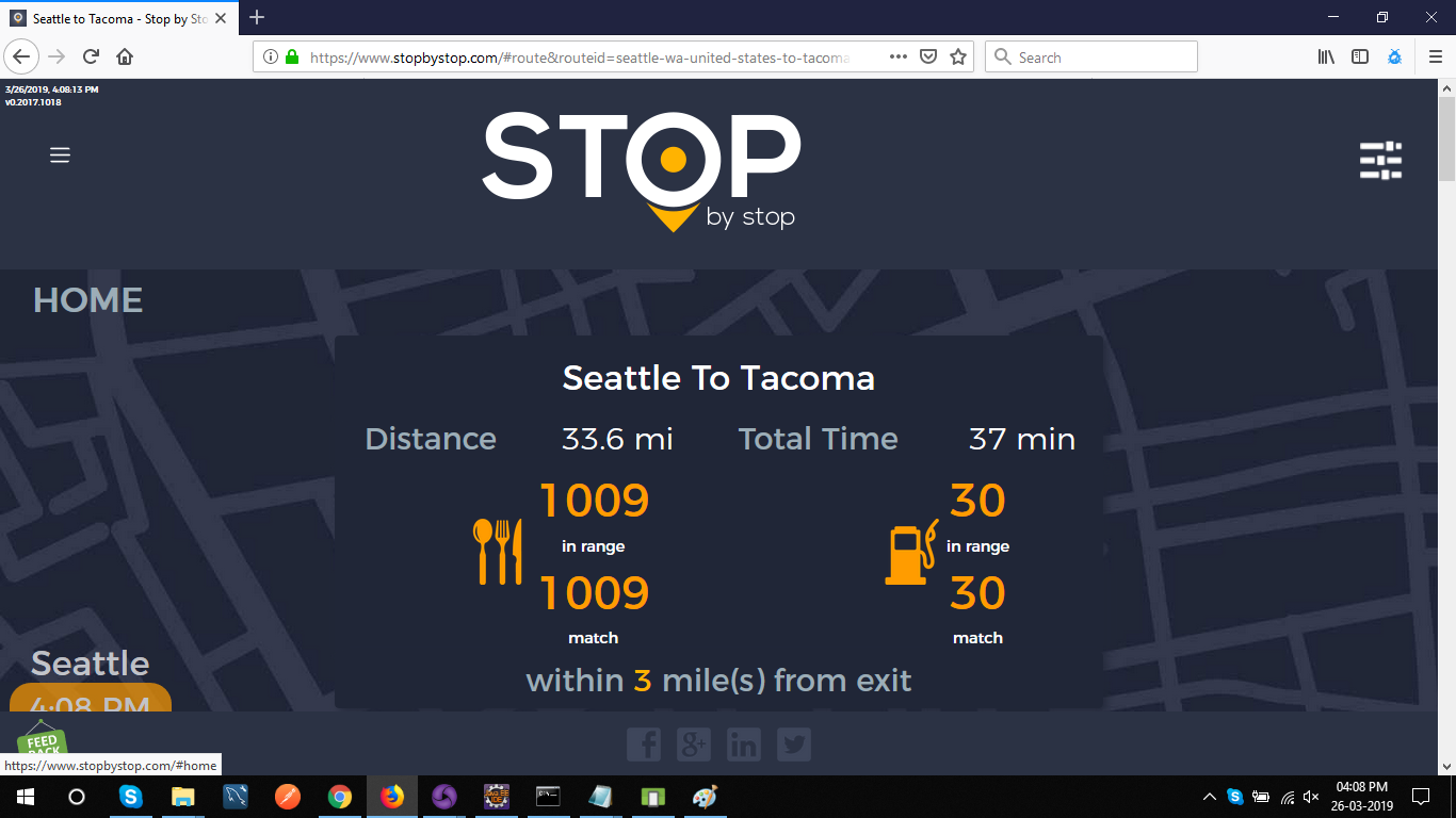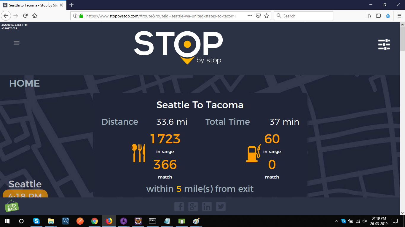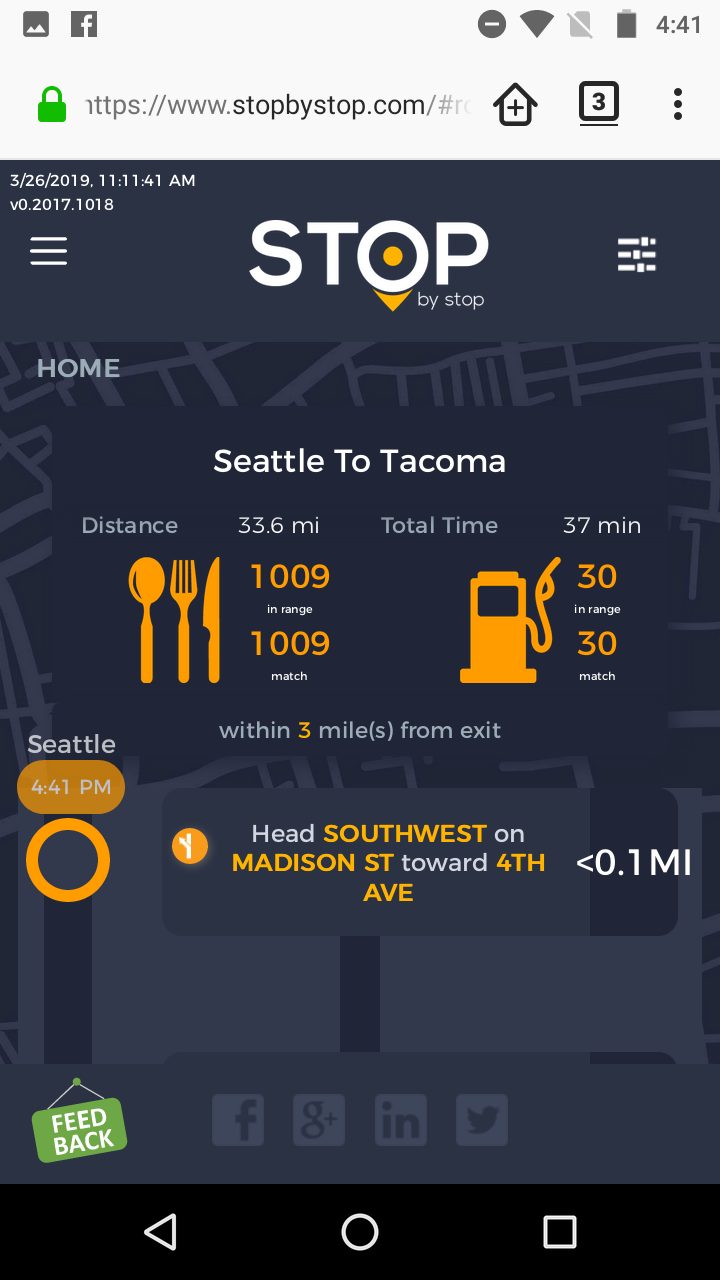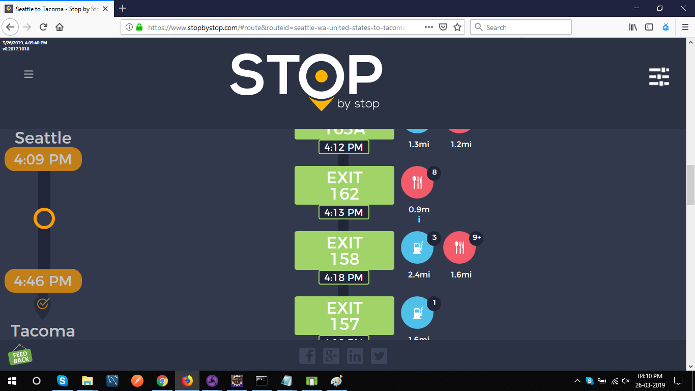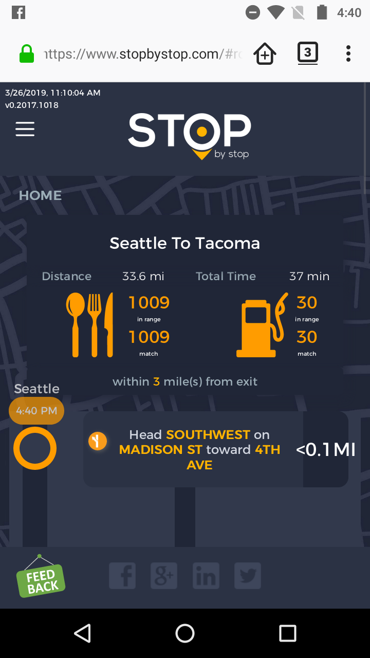 2. RoutePageRefesh. A. Navigate to test_server/ B. Type seat in the first textbox and pick Seattle from the dropdown. C. Type tac in the second textbox and pick Tacoma from the dropdown. D. Click View my trip. E. Route page should open showing exits with restaurants and gas station icons. F. Refresh the browser. Route page should open, NOT home page. Take screenshot. |