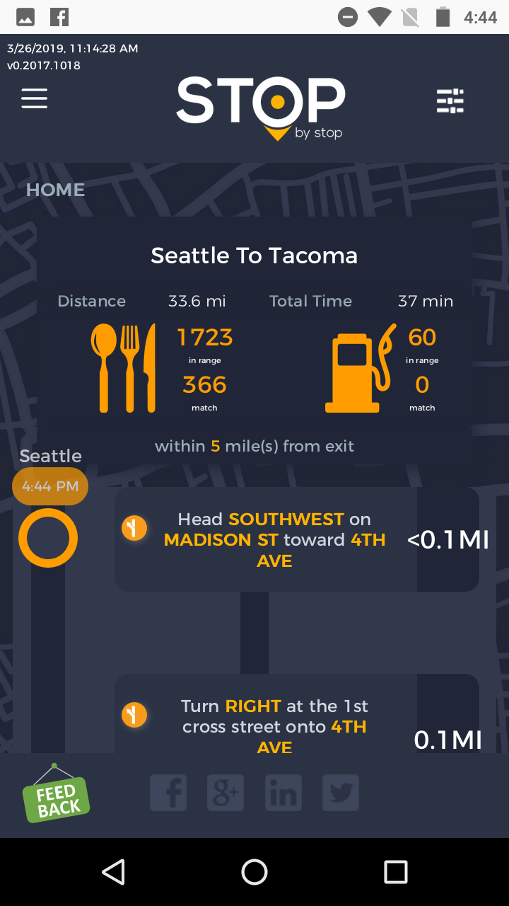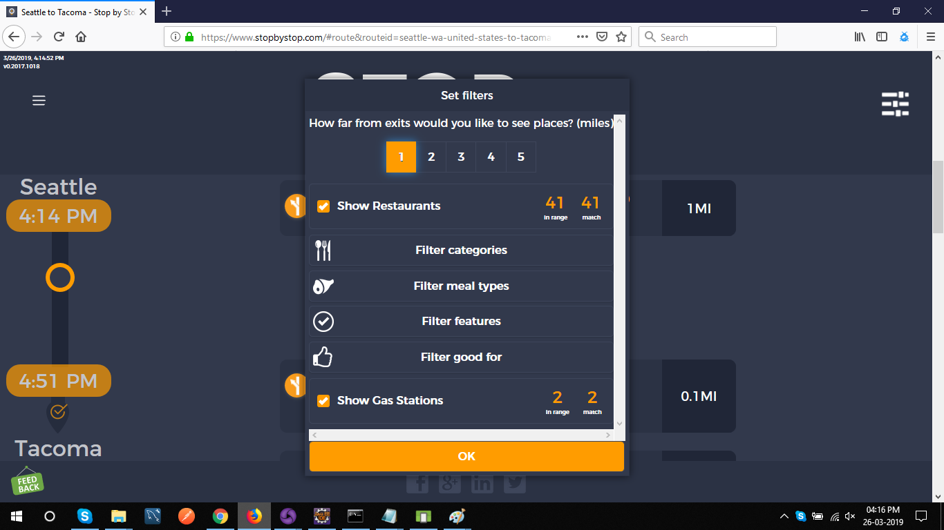 5. FiltersDistancePropagateToExit. A. Open Seattle to Tacoma route. B. Click on Filters and select 1 mile from exit. C. Close Filters popup and navigate to exit page. D. On the exit page open Filters popup and verify that distance settings (1 mile from exit) from route page are propagated. E. Take screenshot. |