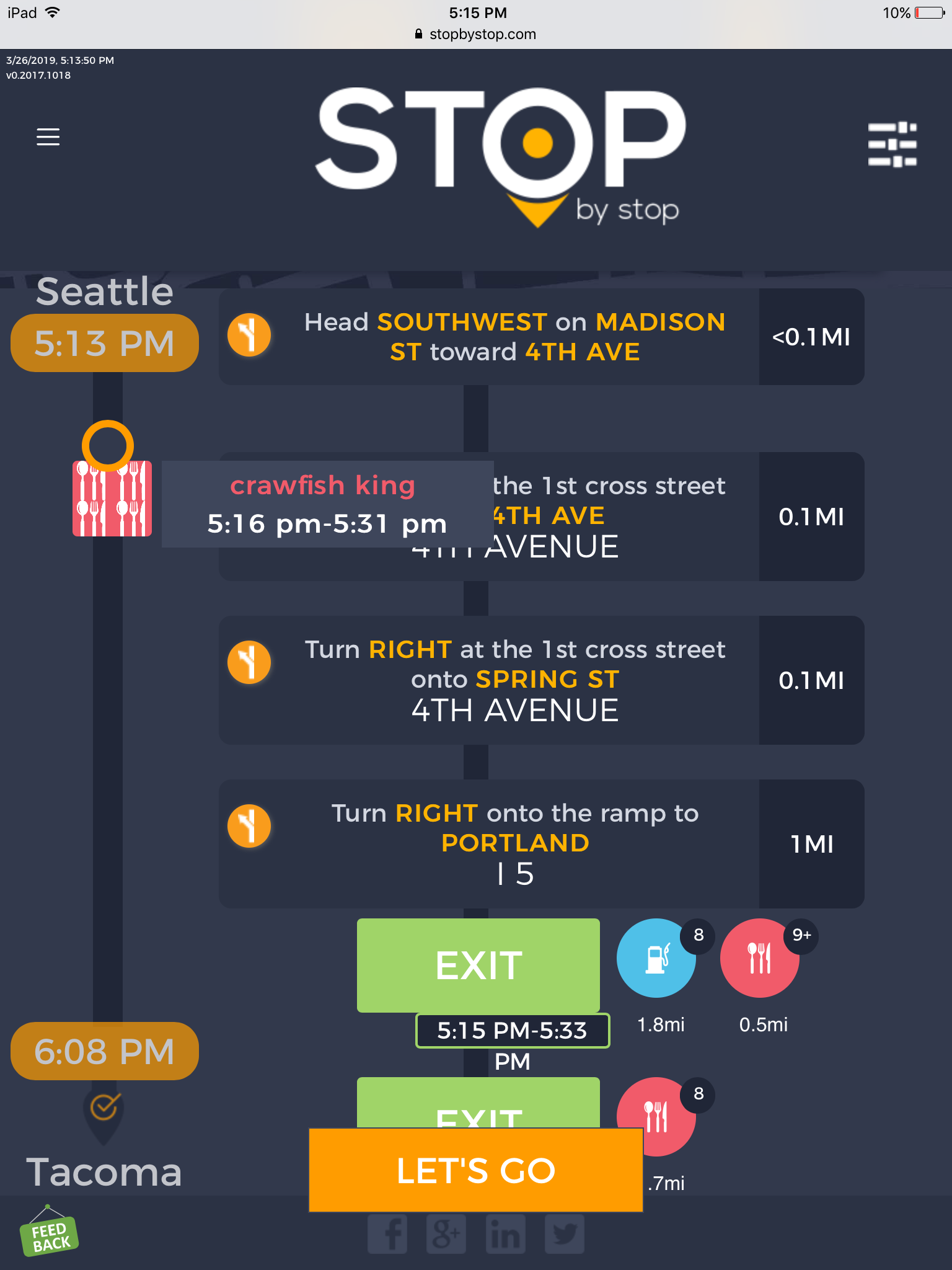 8. POISelectionGoToRoute. A. In the new browser tab open Seattle to Tacoma route. Click on first exit in the road line. Exit page should open. B. On the exit page click on the any item. POI page should open. </br/>C. On the POI page click Add to route button. POI selection popup should open. D. Click Add to route. Route page should open. E. On the sidebar there should be an icon to indicate the the place you picked. F. Click on Let's go button at the bottom of the screen. Google maps should open. Take a screenshot. |