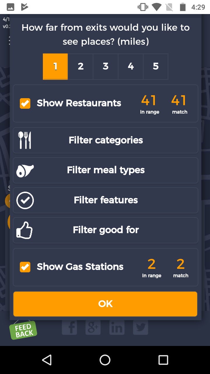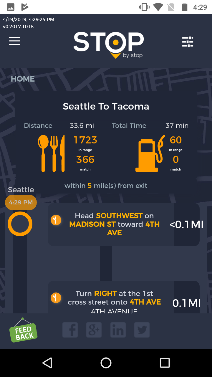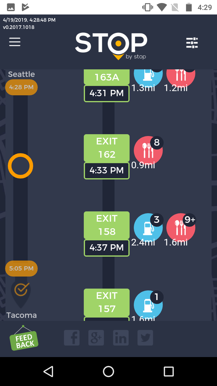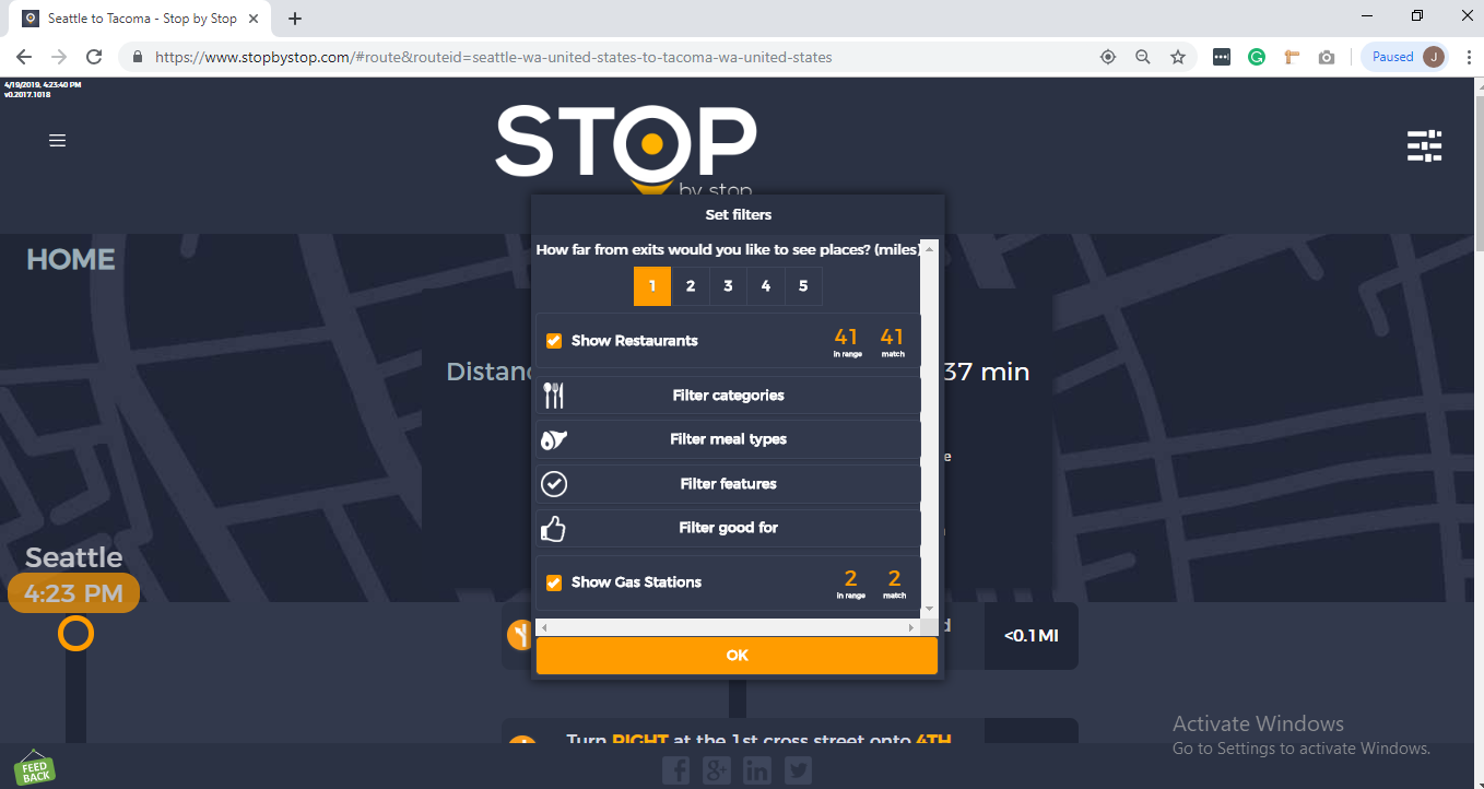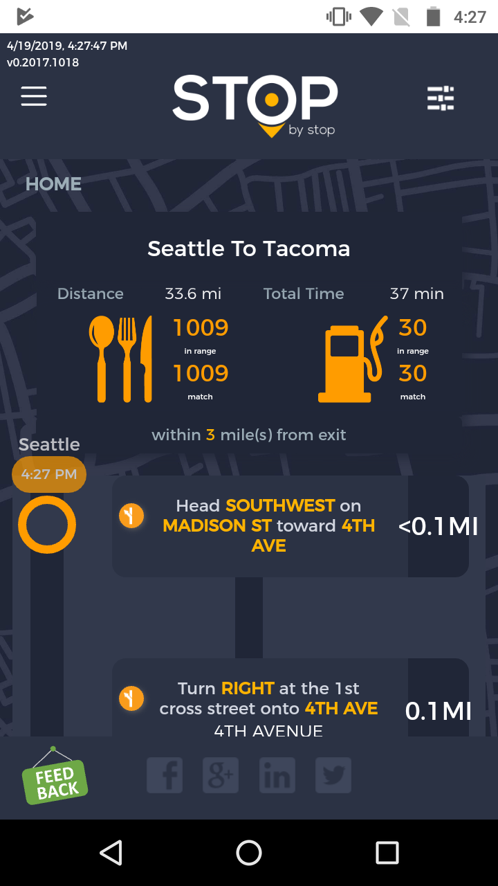 5. FiltersDistancePropagateToExit. A. Open Seattle to Tacoma route. B. Click on Filters and select 1 mile from exit. C. Close Filters popup and navigate to exit page. D. On the exit page open Filters popup and verify that distance settings (1 mile from exit) from route page are propagated. E. Take screenshot. |