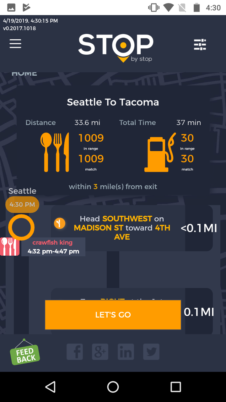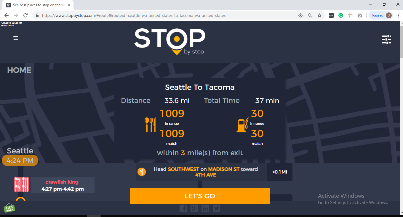 8. POISelectionGoToRoute. A. In the new browser tab open Seattle to Tacoma route. Click on first exit in the road line. Exit page should open. B. On the exit page click on the any item. POI page should open. </br/>C. On the POI page click Add to route button. POI selection popup should open. D. Click Add to route. Route page should open. E. On the sidebar there should be an icon to indicate the the place you picked. F. Click on Let's go button at the bottom of the screen. Google maps should open. Take a screenshot. |