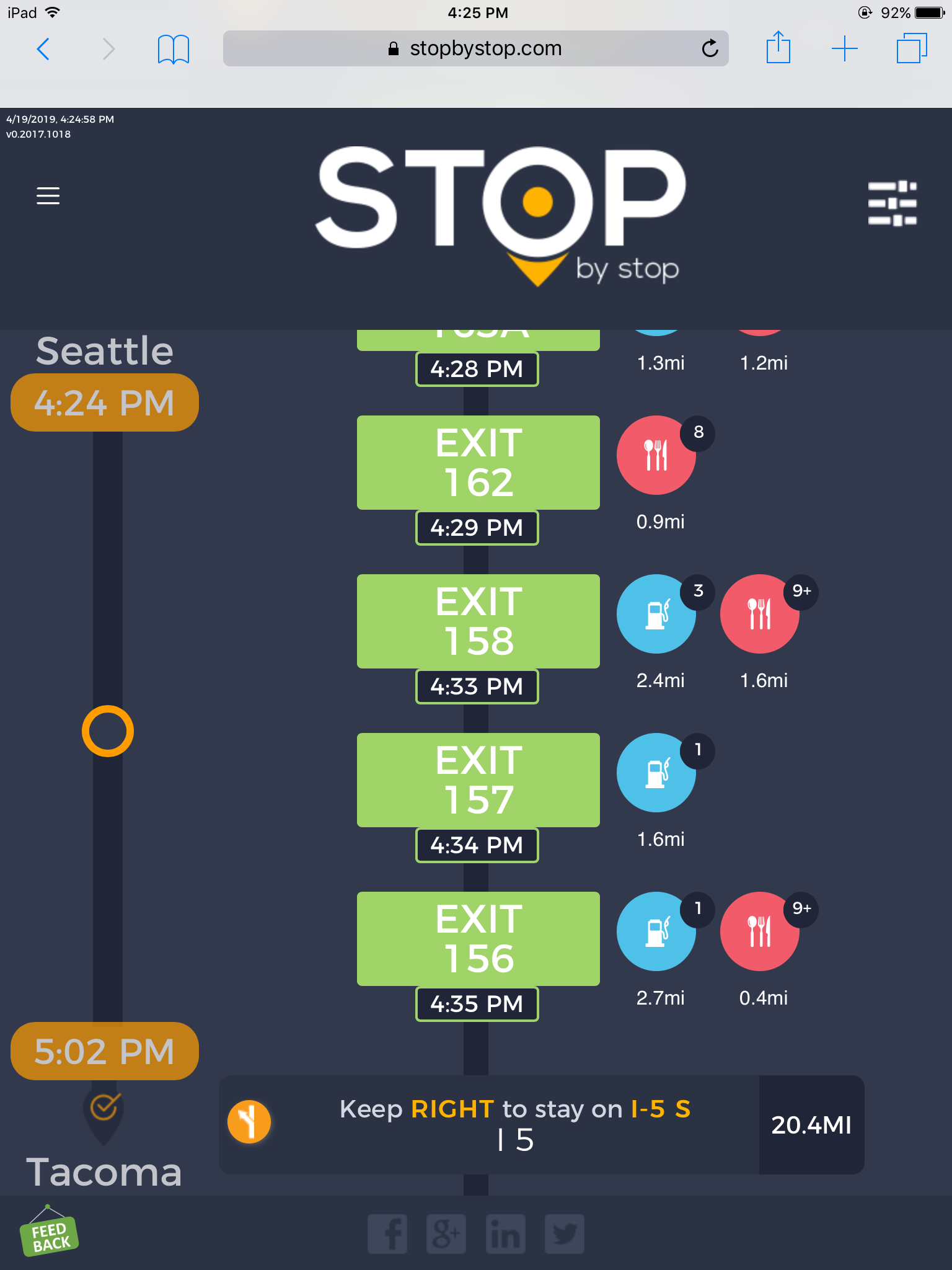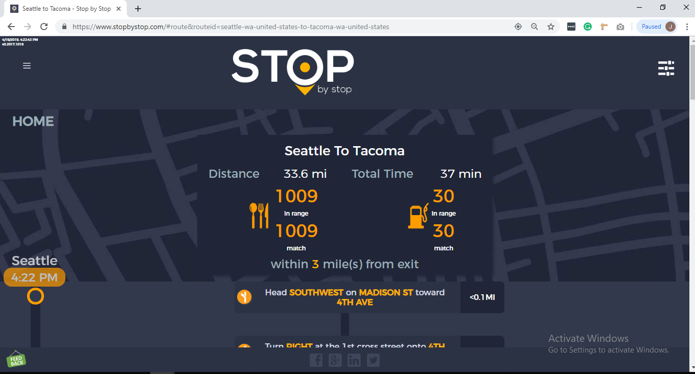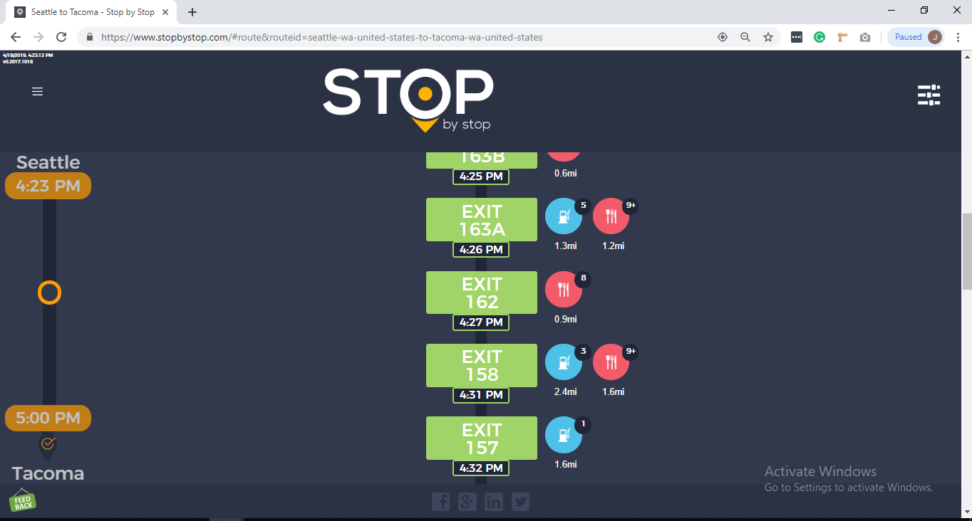 2. RoutePageRefesh. A. Navigate to test_server/ B. Type seat in the first textbox and pick Seattle from the dropdown. C. Type tac in the second textbox and pick Tacoma from the dropdown. D. Click View my trip. E. Route page should open showing exits with restaurants and gas station icons. F. Refresh the browser. Route page should open, NOT home page. Take screenshot. |