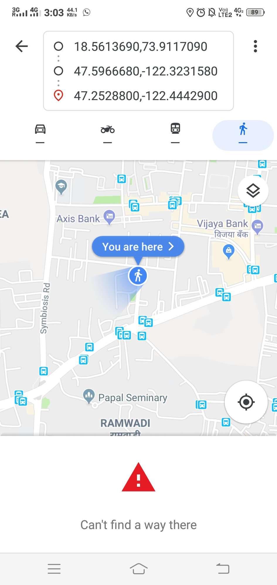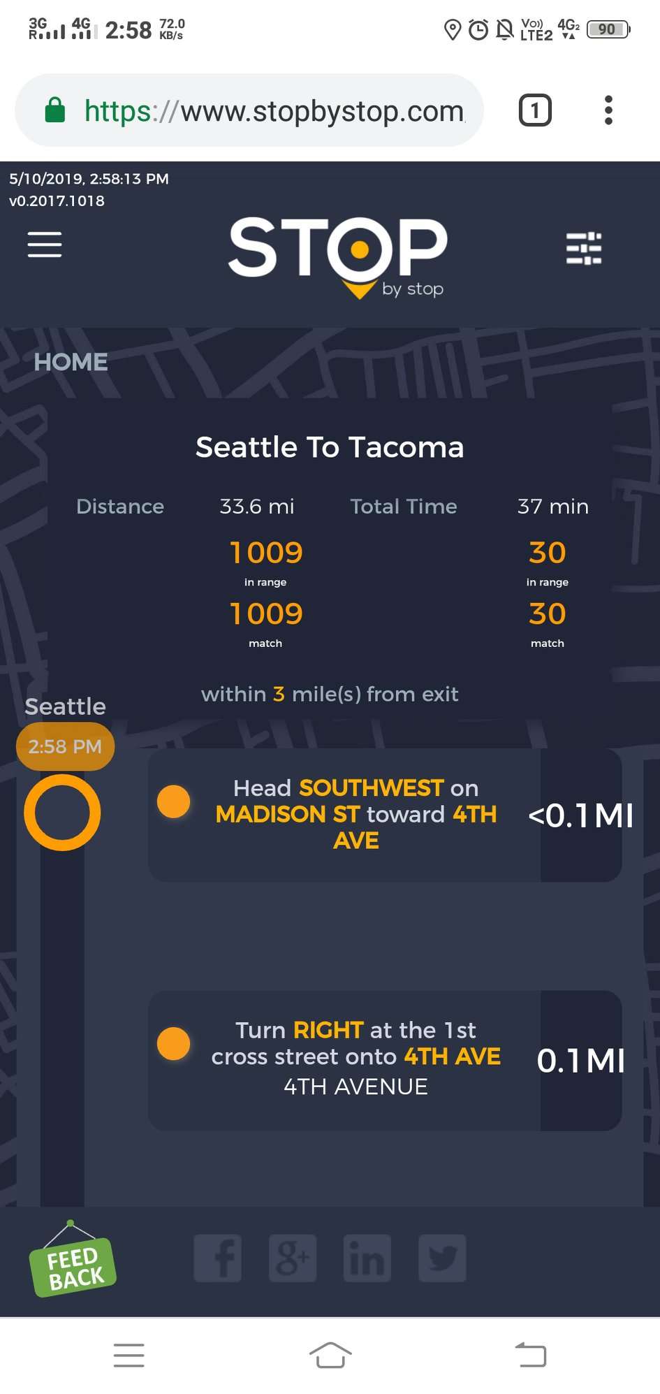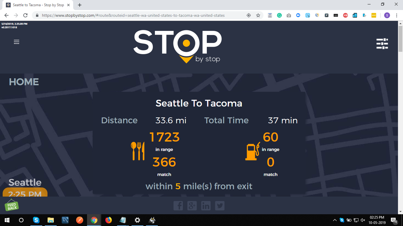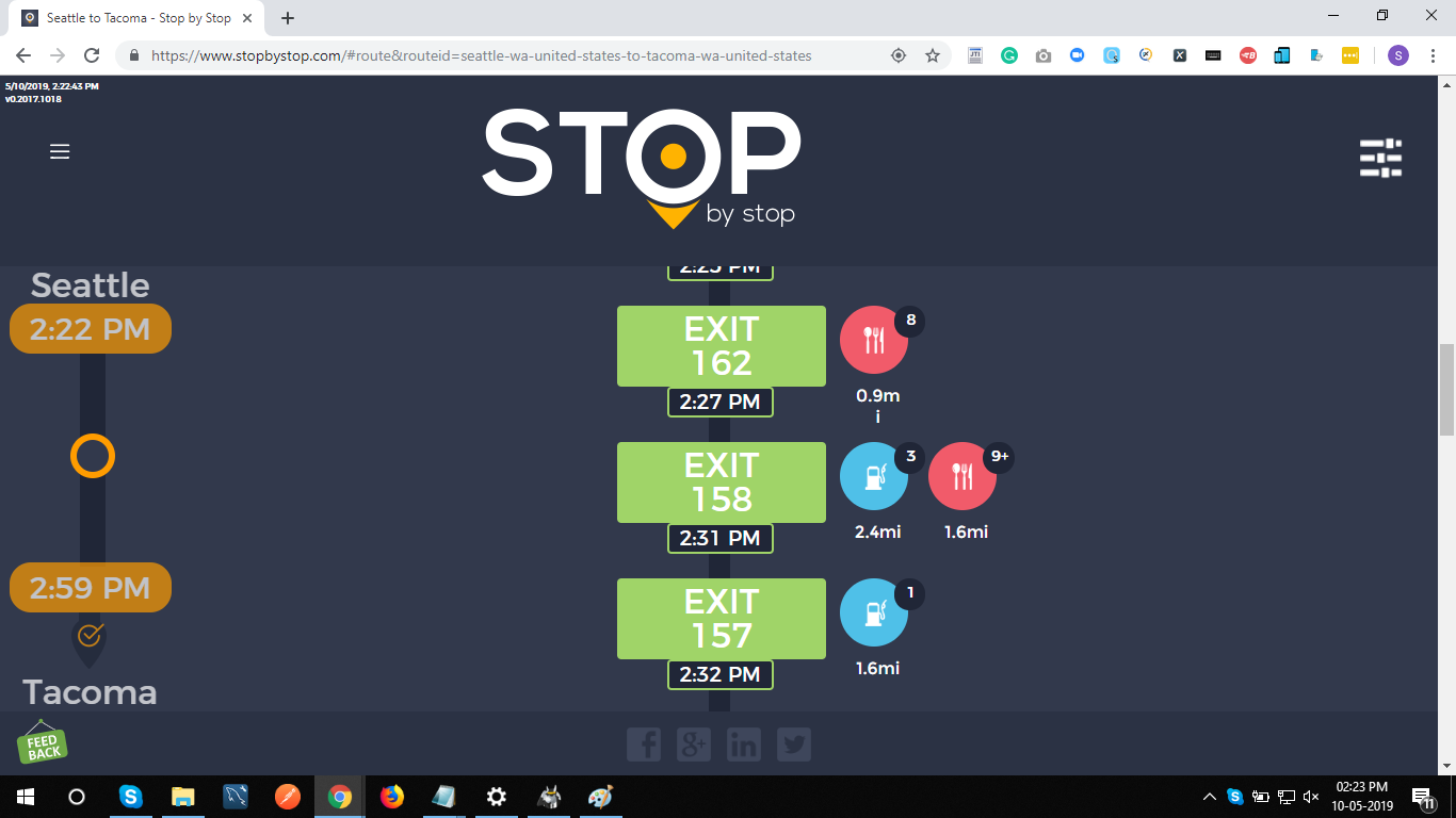 2. RoutePageRefesh. A. Navigate to test_server/ B. Type seat in the first textbox and pick Seattle from the dropdown. C. Type tac in the second textbox and pick Tacoma from the dropdown. D. Click View my trip. E. Route page should open showing exits with restaurants and gas station icons. F. Refresh the browser. Route page should open, NOT home page. Take screenshot. |