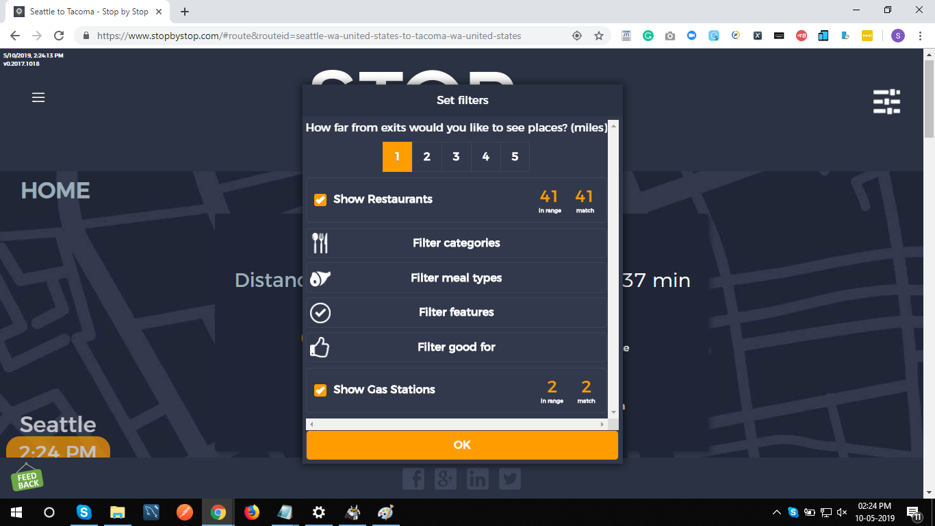 5. FiltersDistancePropagateToExit. A. Open Seattle to Tacoma route. B. Click on Filters and select 1 mile from exit. C. Close Filters popup and navigate to exit page. D. On the exit page open Filters popup and verify that distance settings (1 mile from exit) from route page are propagated. E. Take screenshot. |