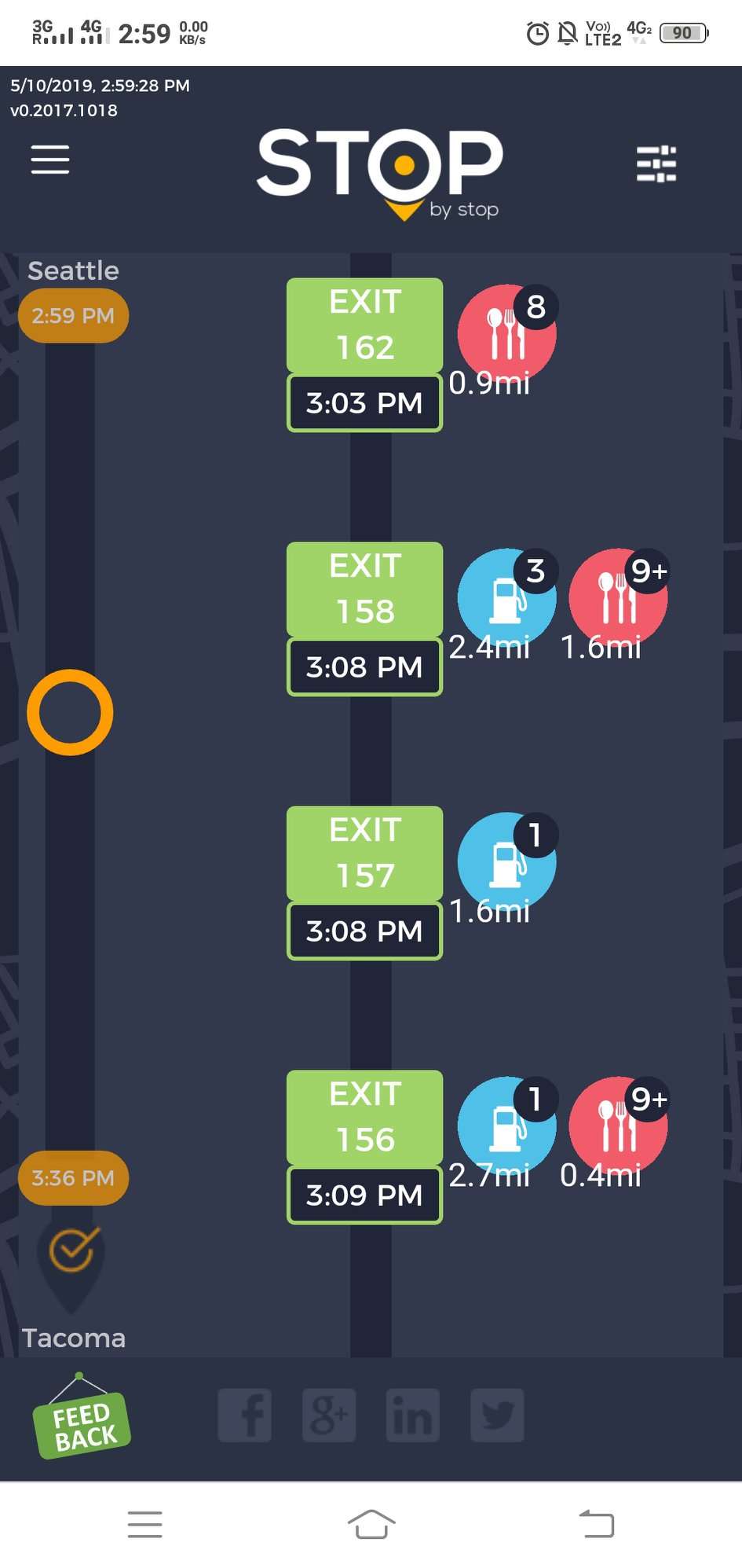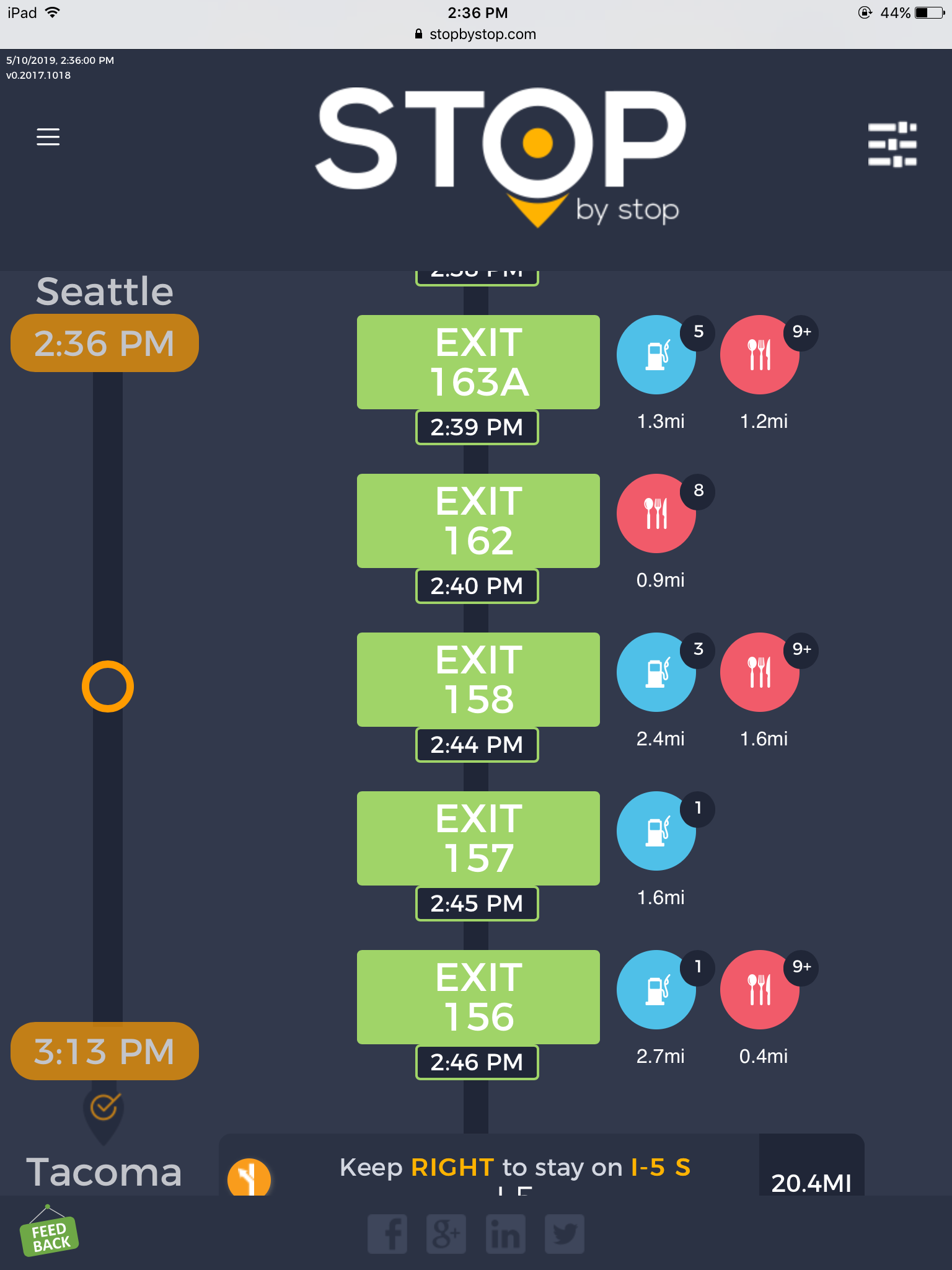 4. ExitPagesNavigation. A. Navigate to test_server/ B. Type Seattle to Tacoma route and navigate. C. Click on first exit. Verify that exit page opens and both - gas stations and restaurants are shown. Click back button in the browser to go back. D. Click on restaurant icon for the same exit and verify that same exit opens, but only restaurants are shown. Go back. E. Click on gas station icon for the same exit and verify that same exit opens, but only gas stations are shown. F. Verify that clicking on Phone icon opens Phone application. Some of the items (but not all of them) will have Yelp icon displayed next to them. Verify that clicking on Yelp icon navigates to Yelp website. Take a screenshot from Yelp website. |