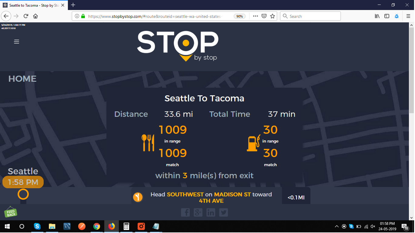 2. RoutePageRefesh. A. Navigate to test_server/ B. Type seat in the first textbox and pick Seattle from the dropdown. C. Type tac in the second textbox and pick Tacoma from the dropdown. D. Click View my trip. E. Route page should open showing exits with restaurants and gas station icons. F. Refresh the browser. Route page should open, NOT home page. Take screenshot. |