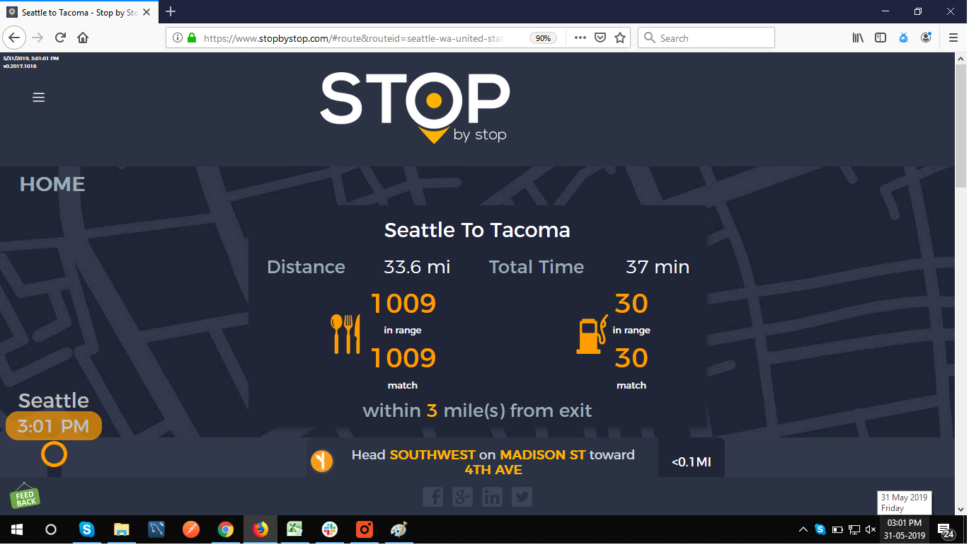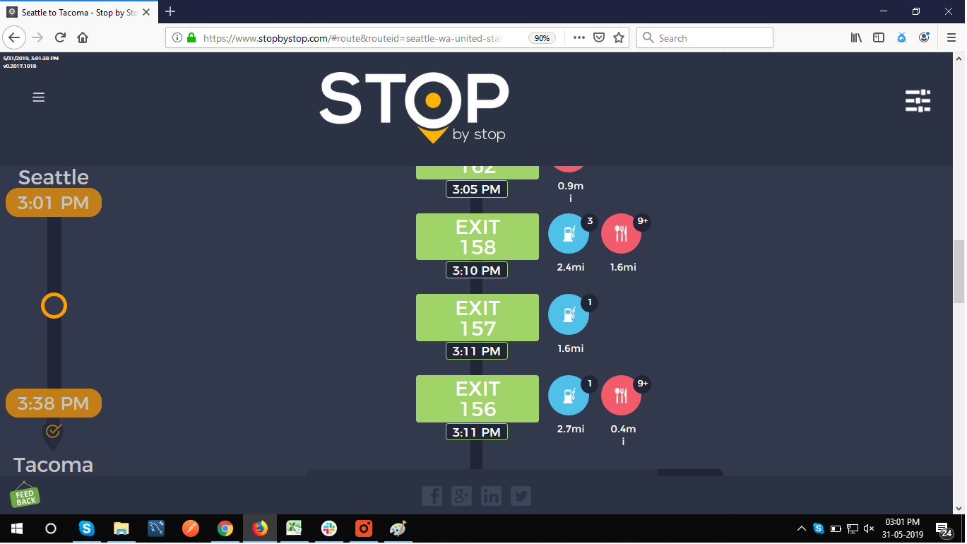 2. RoutePageRefesh. A. Navigate to test_server/ B. Type seat in the first textbox and pick Seattle from the dropdown. C. Type tac in the second textbox and pick Tacoma from the dropdown. D. Click View my trip. E. Route page should open showing exits with restaurants and gas station icons. F. Refresh the browser. Route page should open, NOT home page. Take screenshot. |
