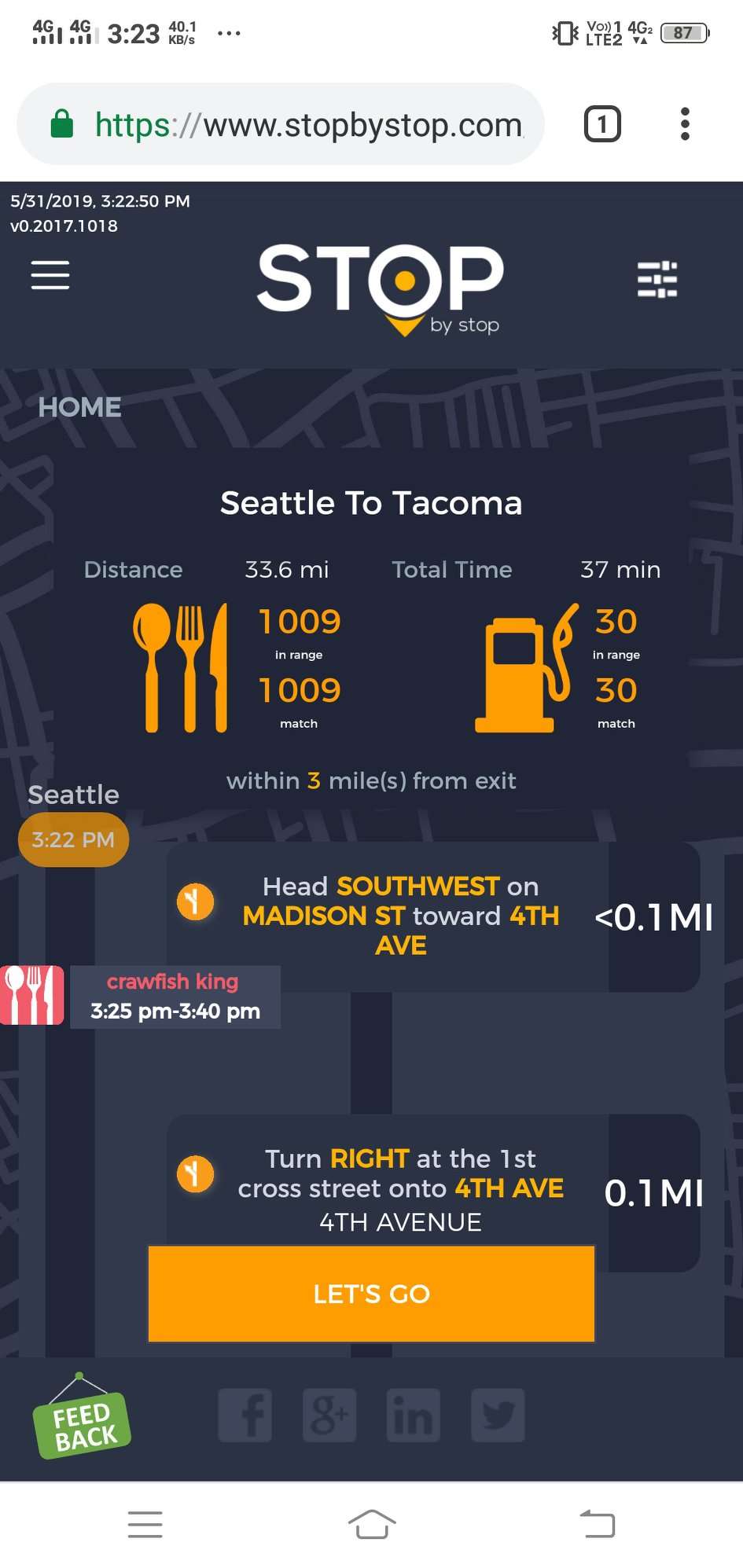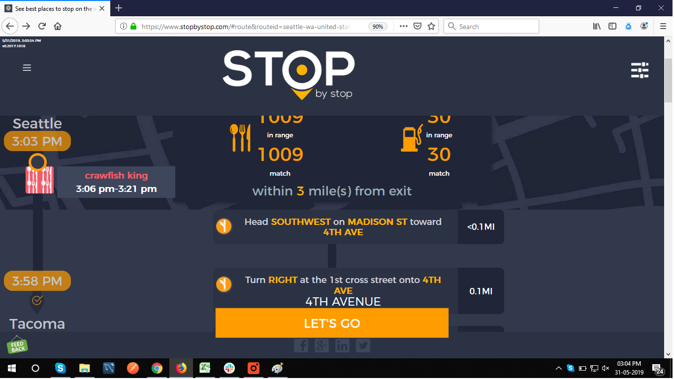 8. POISelectionGoToRoute. A. In the new browser tab open Seattle to Tacoma route. Click on first exit in the road line. Exit page should open. B. On the exit page click on the any item. POI page should open. </br/>C. On the POI page click Add to route button. POI selection popup should open. D. Click Add to route. Route page should open. E. On the sidebar there should be an icon to indicate the the place you picked. F. Click on Let's go button at the bottom of the screen. Google maps should open. Take a screenshot. |