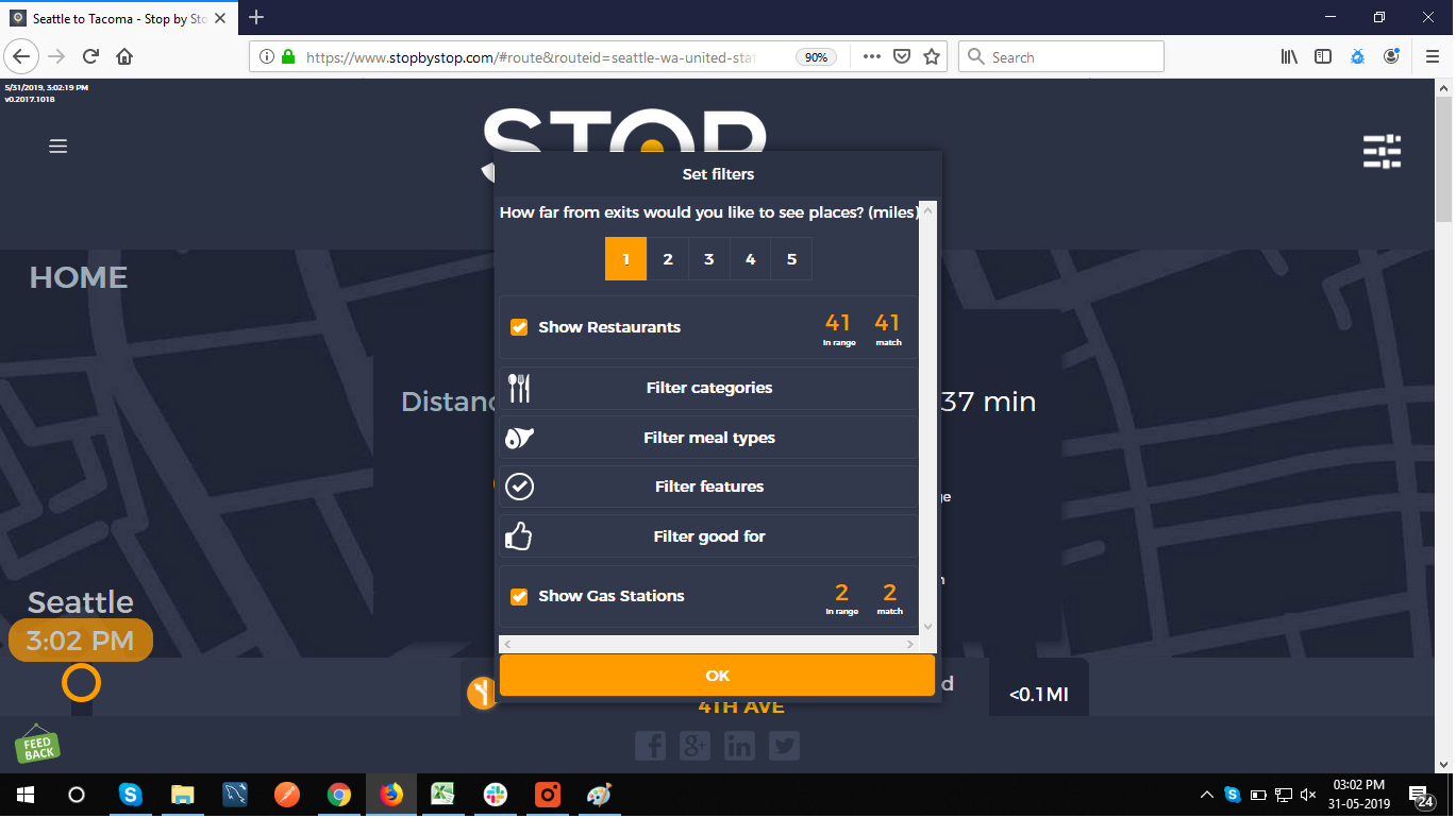 5. FiltersDistancePropagateToExit. A. Open Seattle to Tacoma route. B. Click on Filters and select 1 mile from exit. C. Close Filters popup and navigate to exit page. D. On the exit page open Filters popup and verify that distance settings (1 mile from exit) from route page are propagated. E. Take screenshot. |