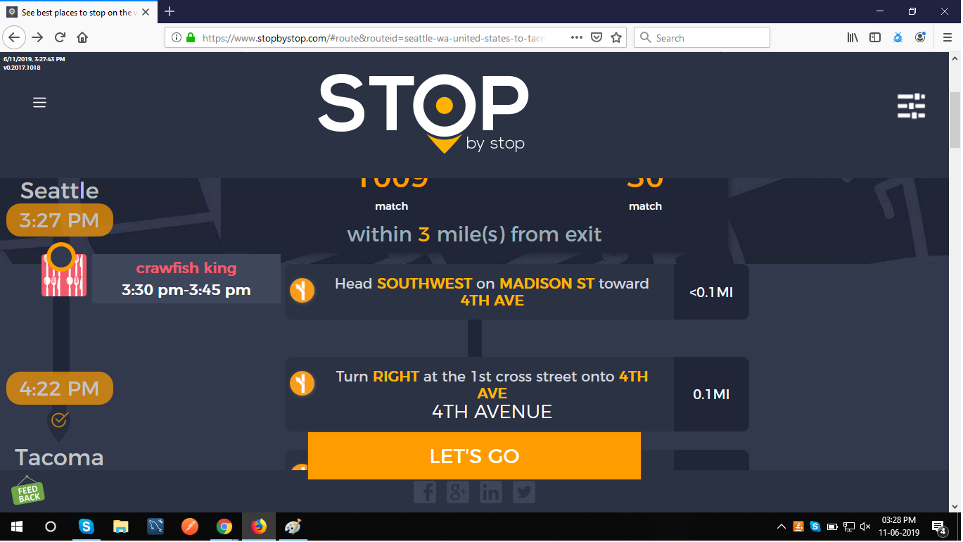 8. POISelectionGoToRoute. A. In the new browser tab open Seattle to Tacoma route. Click on first exit in the road line. Exit page should open. B. On the exit page click on the any item. POI page should open. </br/>C. On the POI page click Add to route button. POI selection popup should open. D. Click Add to route. Route page should open. E. On the sidebar there should be an icon to indicate the the place you picked. F. Click on Let's go button at the bottom of the screen. Google maps should open. Take a screenshot. |