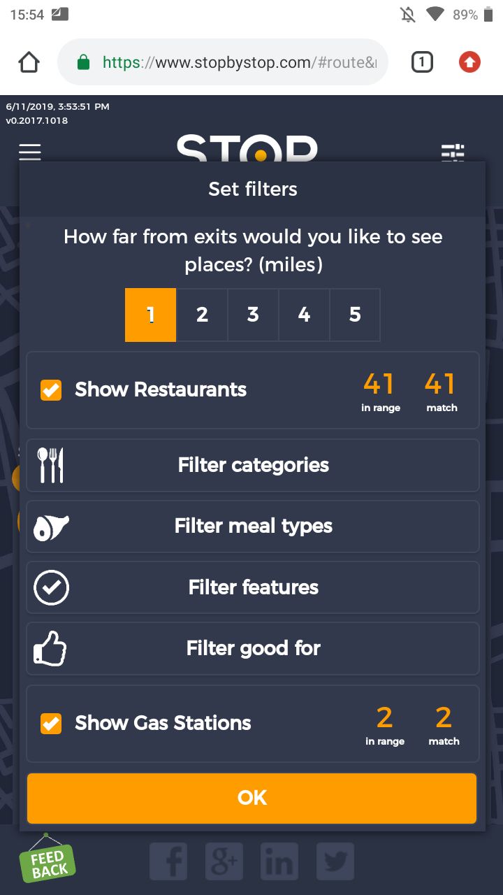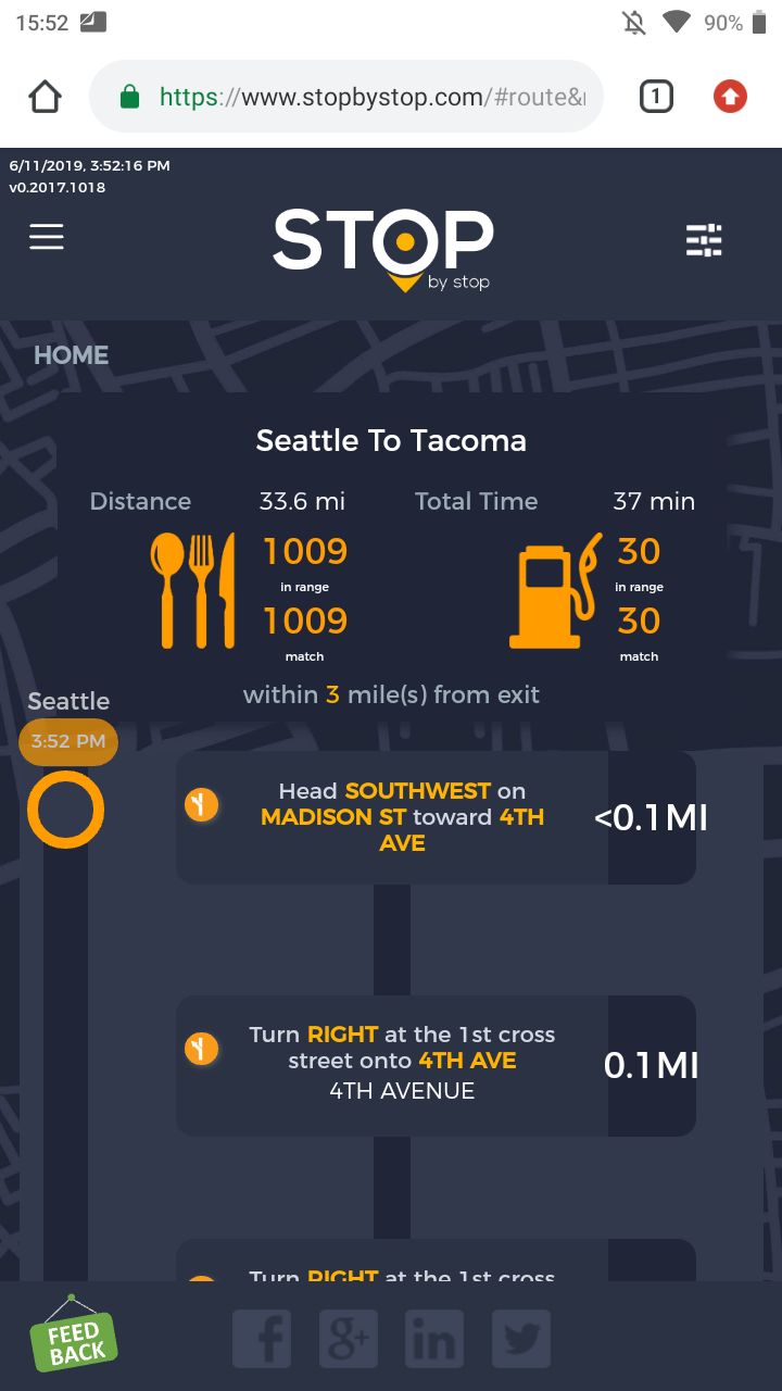 5. FiltersDistancePropagateToExit. A. Open Seattle to Tacoma route. B. Click on Filters and select 1 mile from exit. C. Close Filters popup and navigate to exit page. D. On the exit page open Filters popup and verify that distance settings (1 mile from exit) from route page are propagated. E. Take screenshot. |