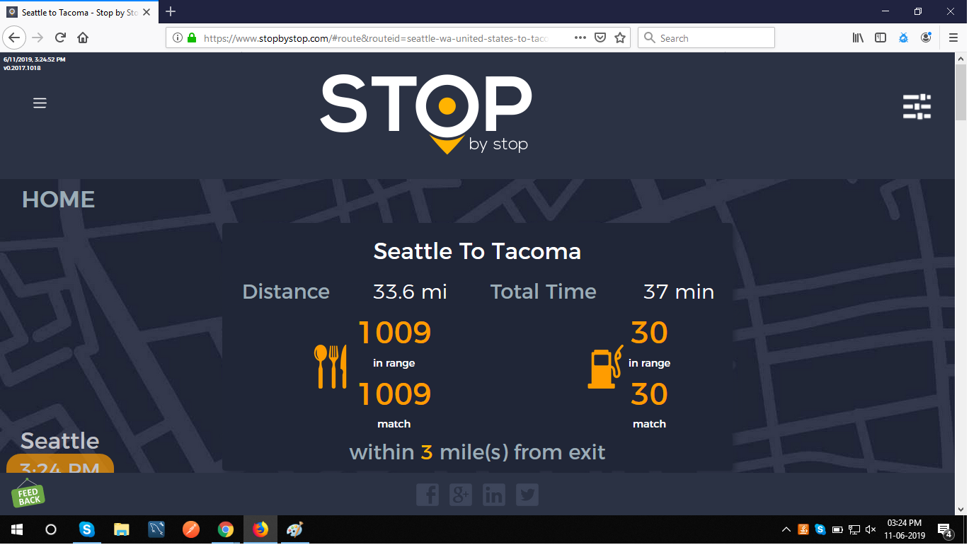 2. RoutePageRefesh. A. Navigate to test_server/ B. Type seat in the first textbox and pick Seattle from the dropdown. C. Type tac in the second textbox and pick Tacoma from the dropdown. D. Click View my trip. E. Route page should open showing exits with restaurants and gas station icons. F. Refresh the browser. Route page should open, NOT home page. Take screenshot. |