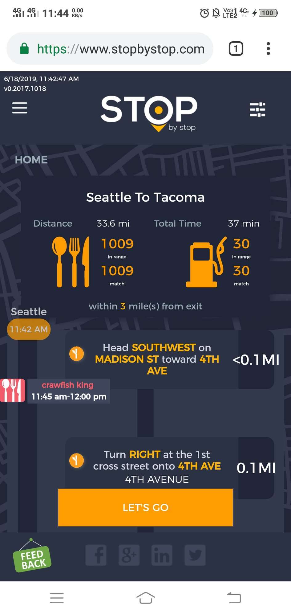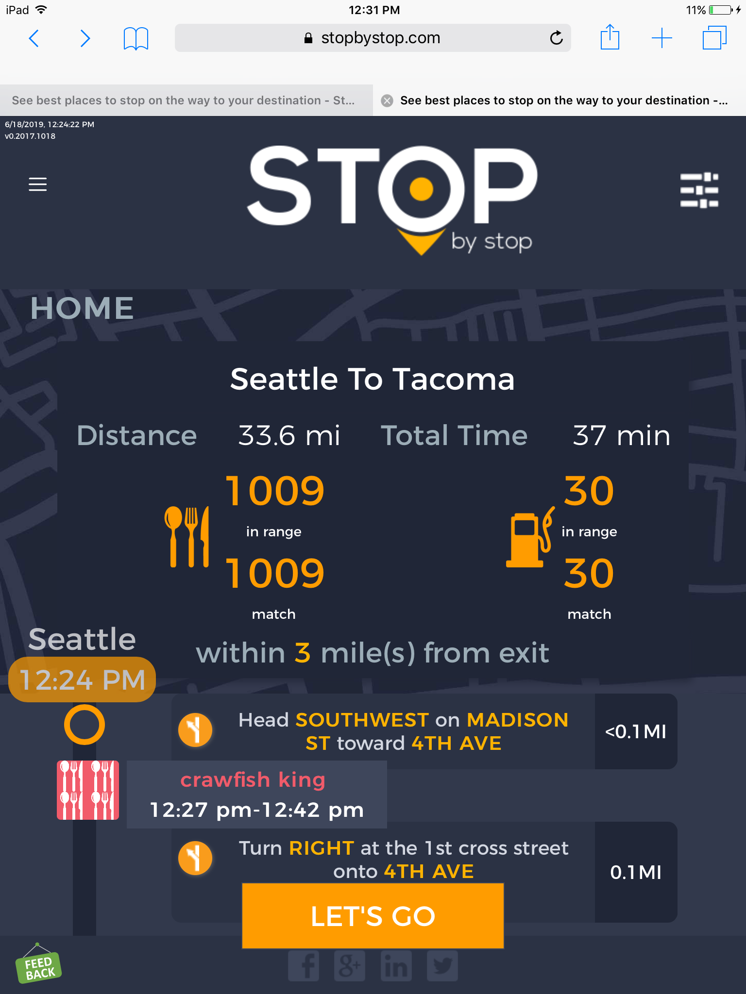 8. POISelectionGoToRoute. A. In the new browser tab open Seattle to Tacoma route. Click on first exit in the road line. Exit page should open. B. On the exit page click on the any item. POI page should open. </br/>C. On the POI page click Add to route button. POI selection popup should open. D. Click Add to route. Route page should open. E. On the sidebar there should be an icon to indicate the the place you picked. F. Click on Let's go button at the bottom of the screen. Google maps should open. Take a screenshot. |