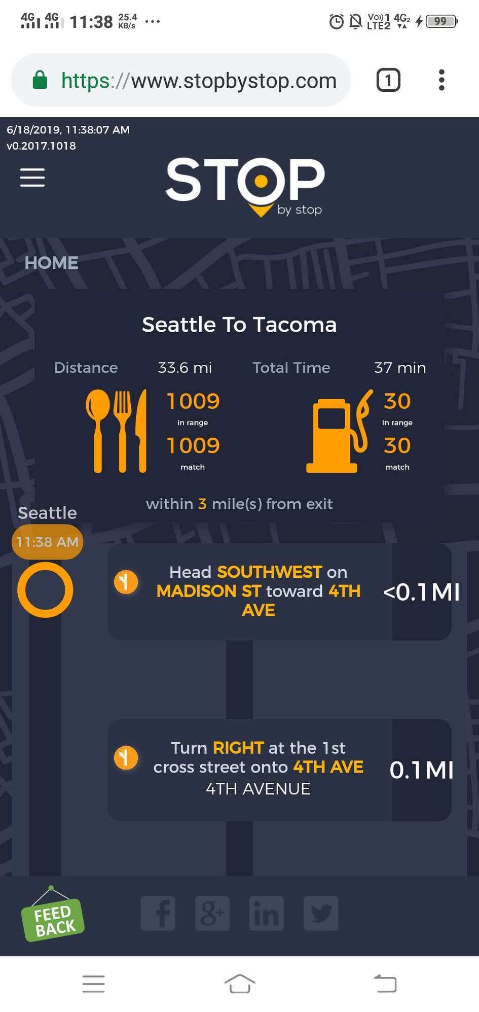 2. RoutePageRefesh. A. Navigate to test_server/ B. Type seat in the first textbox and pick Seattle from the dropdown. C. Type tac in the second textbox and pick Tacoma from the dropdown. D. Click View my trip. E. Route page should open showing exits with restaurants and gas station icons. F. Refresh the browser. Route page should open, NOT home page. Take screenshot. |