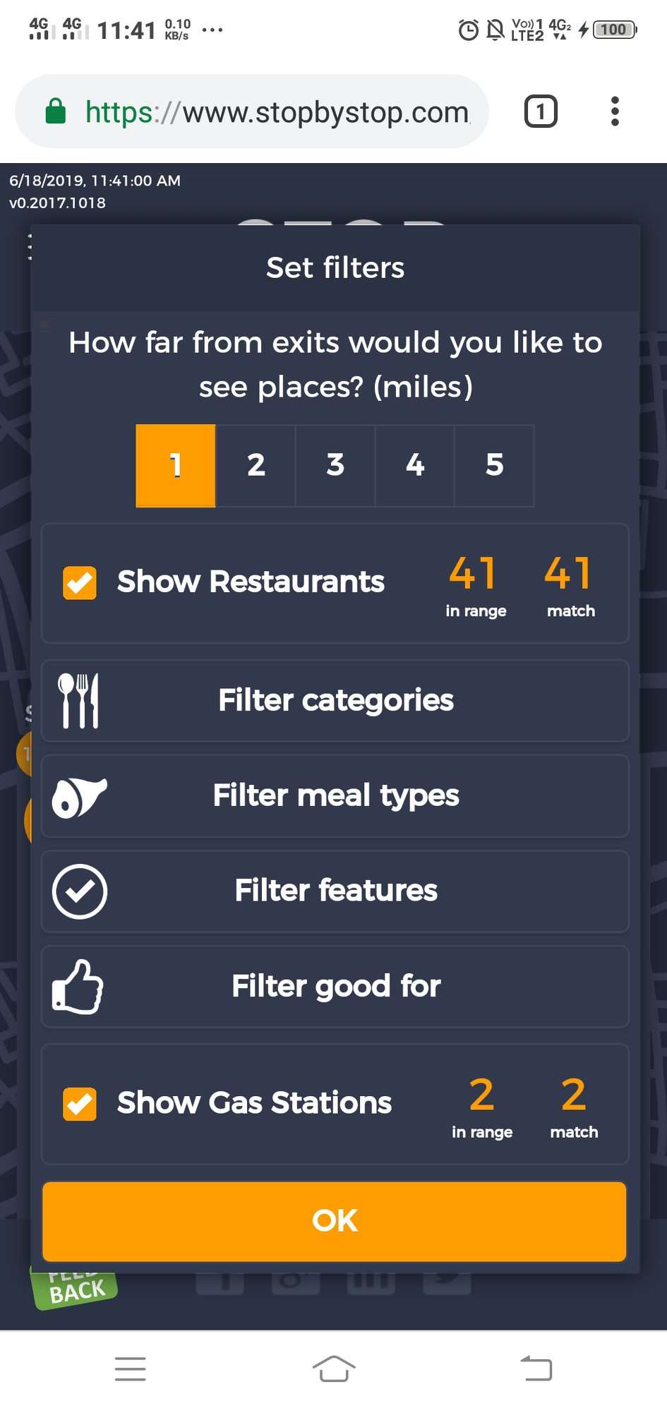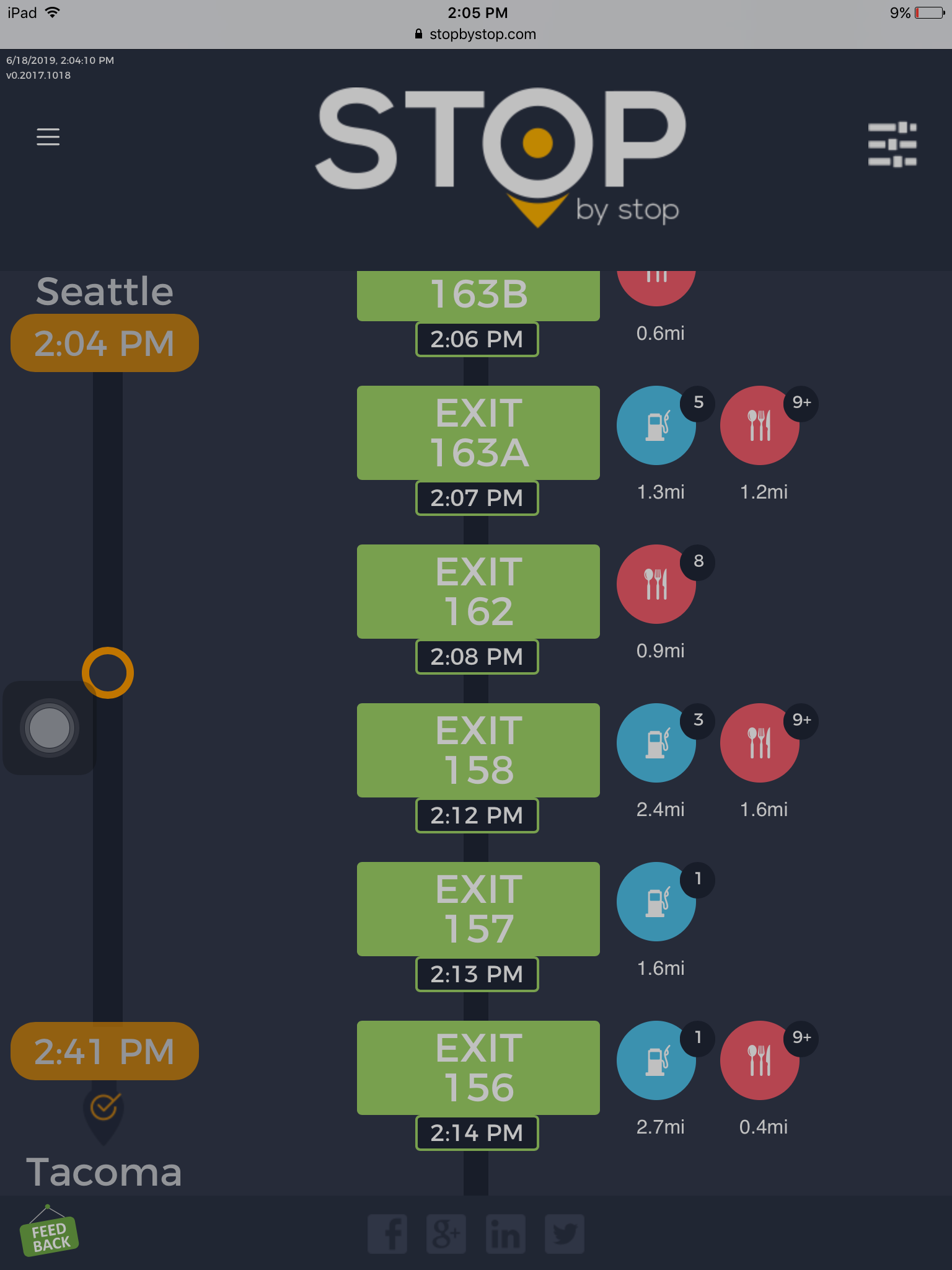 5. FiltersDistancePropagateToExit. A. Open Seattle to Tacoma route. B. Click on Filters and select 1 mile from exit. C. Close Filters popup and navigate to exit page. D. On the exit page open Filters popup and verify that distance settings (1 mile from exit) from route page are propagated. E. Take screenshot. |