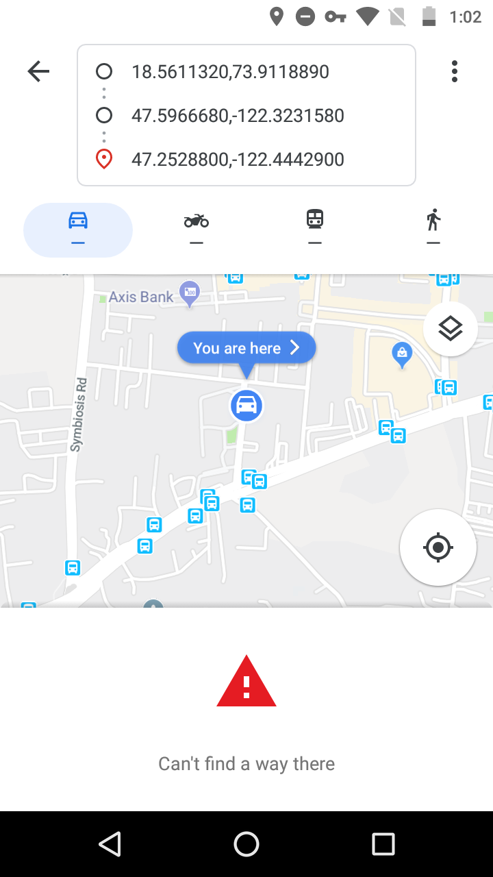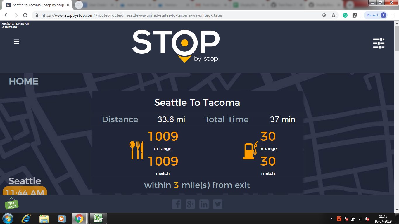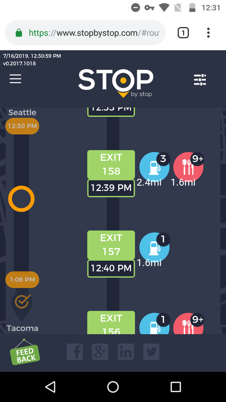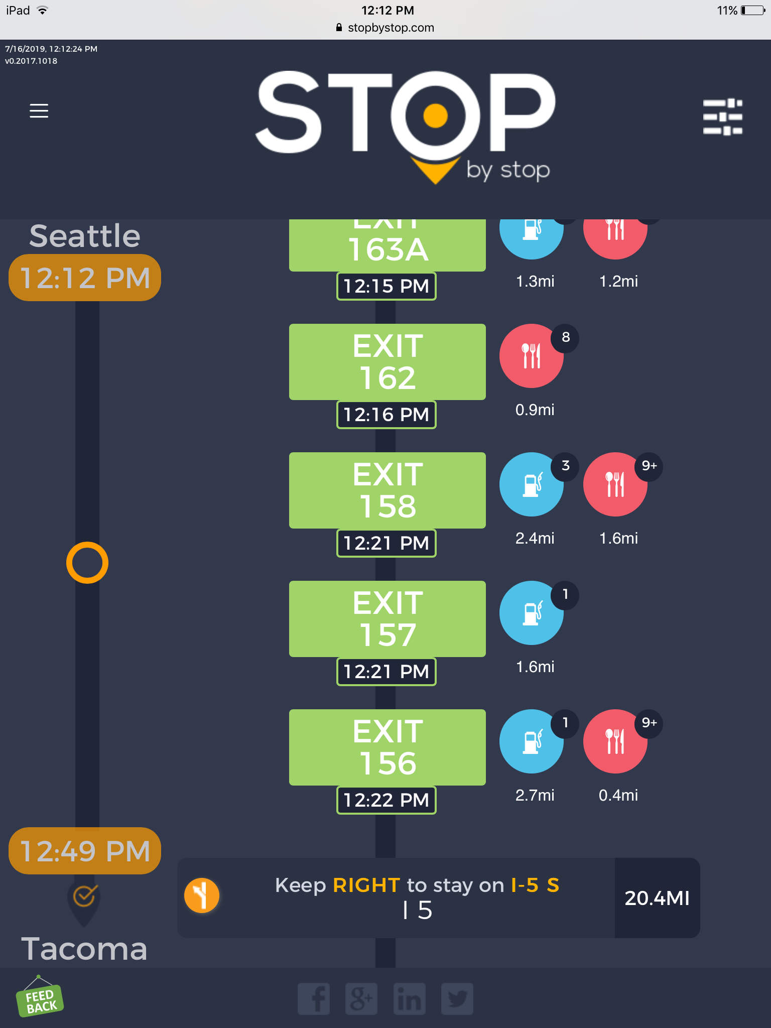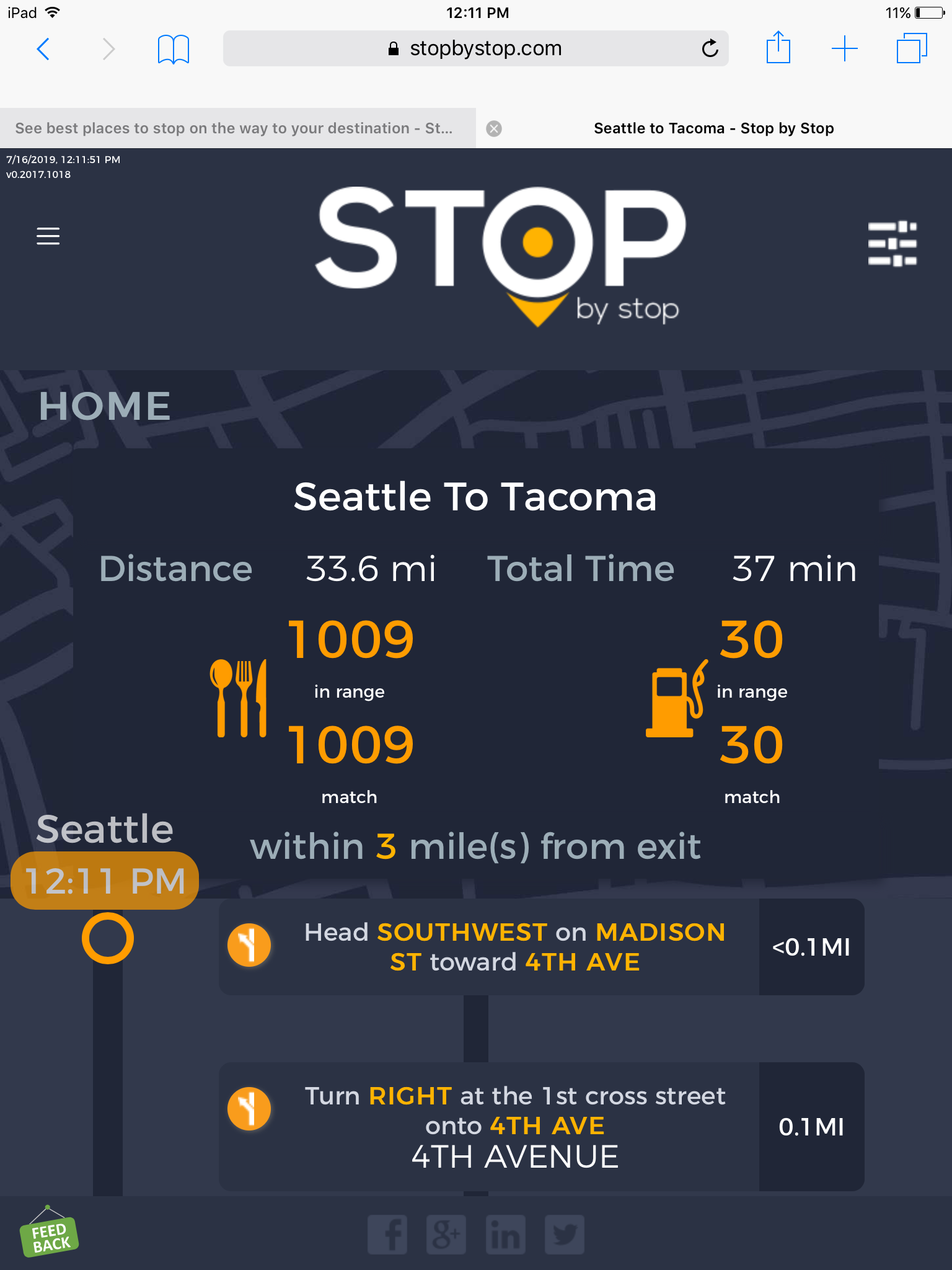 2. RoutePageRefesh. A. Navigate to test_server/ B. Type seat in the first textbox and pick Seattle from the dropdown. C. Type tac in the second textbox and pick Tacoma from the dropdown. D. Click View my trip. E. Route page should open showing exits with restaurants and gas station icons. F. Refresh the browser. Route page should open, NOT home page. Take screenshot. |