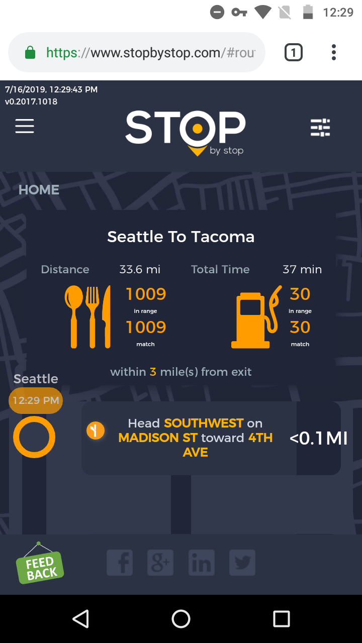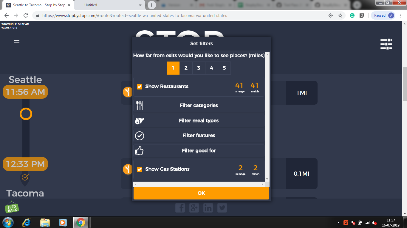 5. FiltersDistancePropagateToExit. A. Open Seattle to Tacoma route. B. Click on Filters and select 1 mile from exit. C. Close Filters popup and navigate to exit page. D. On the exit page open Filters popup and verify that distance settings (1 mile from exit) from route page are propagated. E. Take screenshot. |