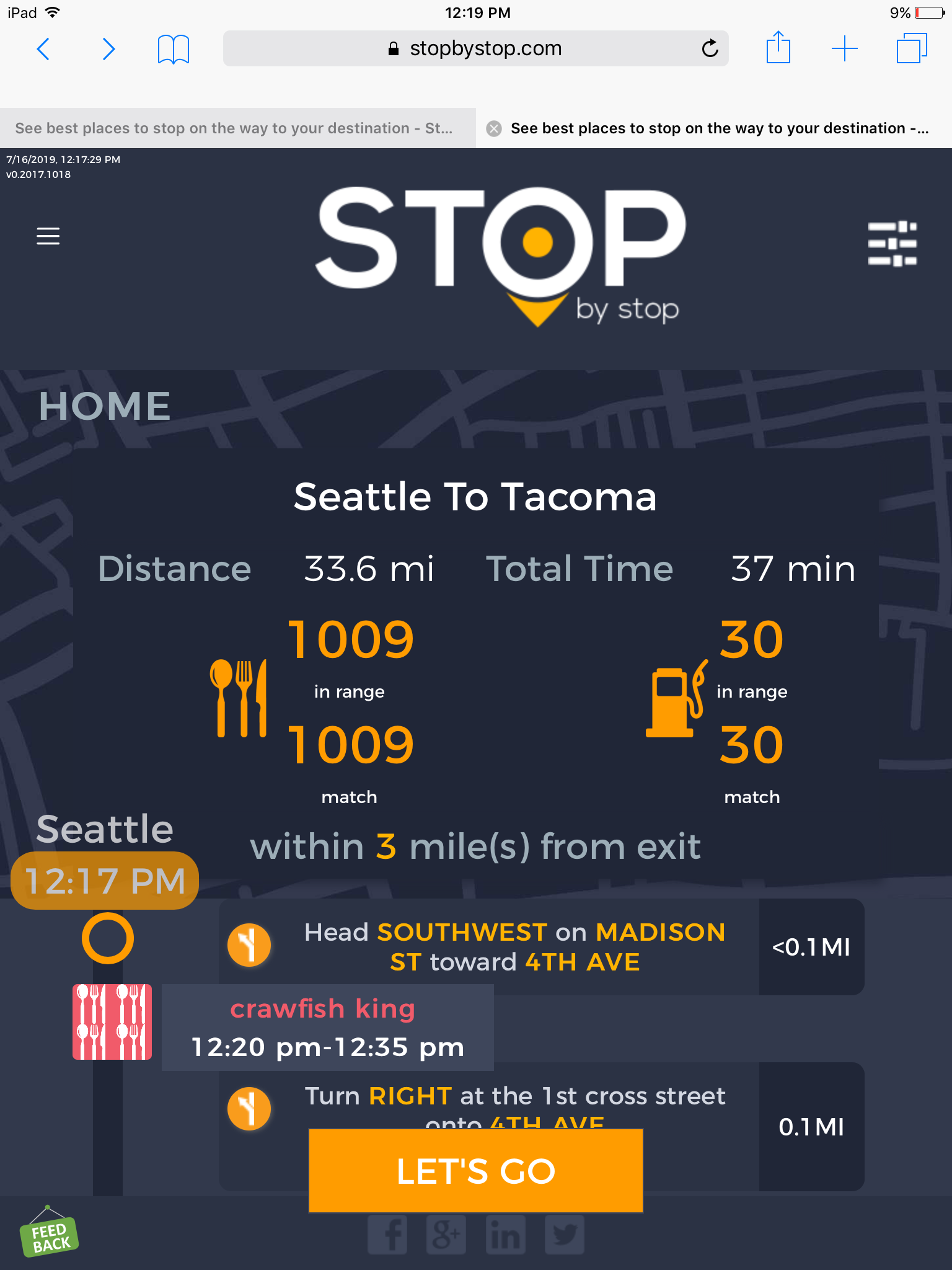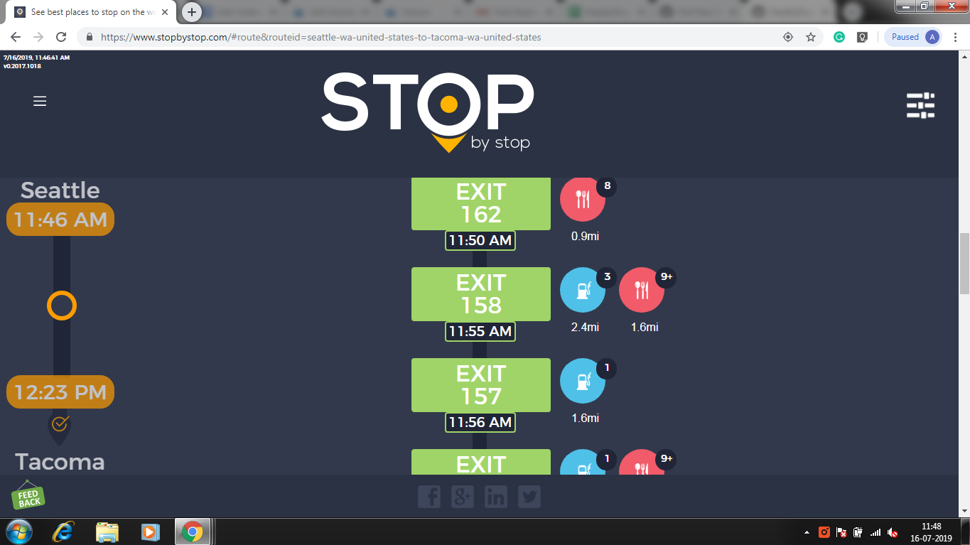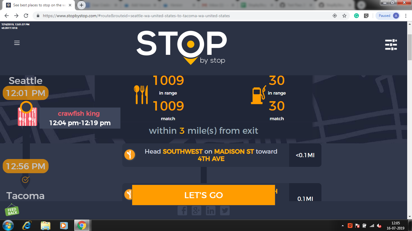 8. POISelectionGoToRoute. A. In the new browser tab open Seattle to Tacoma route. Click on first exit in the road line. Exit page should open. B. On the exit page click on the any item. POI page should open. </br/>C. On the POI page click Add to route button. POI selection popup should open. D. Click Add to route. Route page should open. E. On the sidebar there should be an icon to indicate the the place you picked. F. Click on Let's go button at the bottom of the screen. Google maps should open. Take a screenshot. |