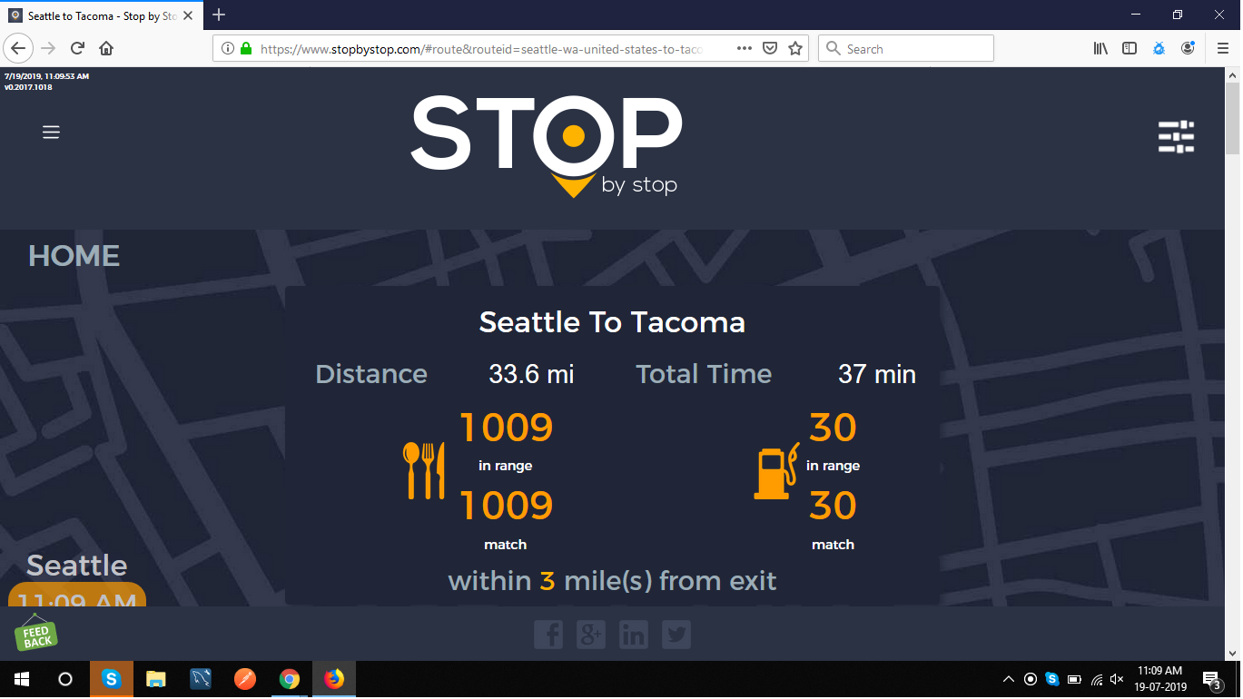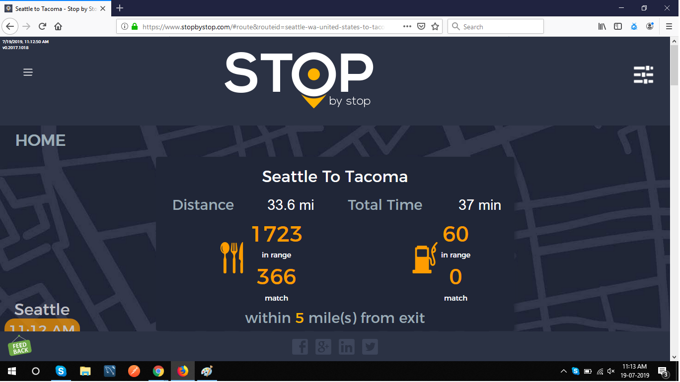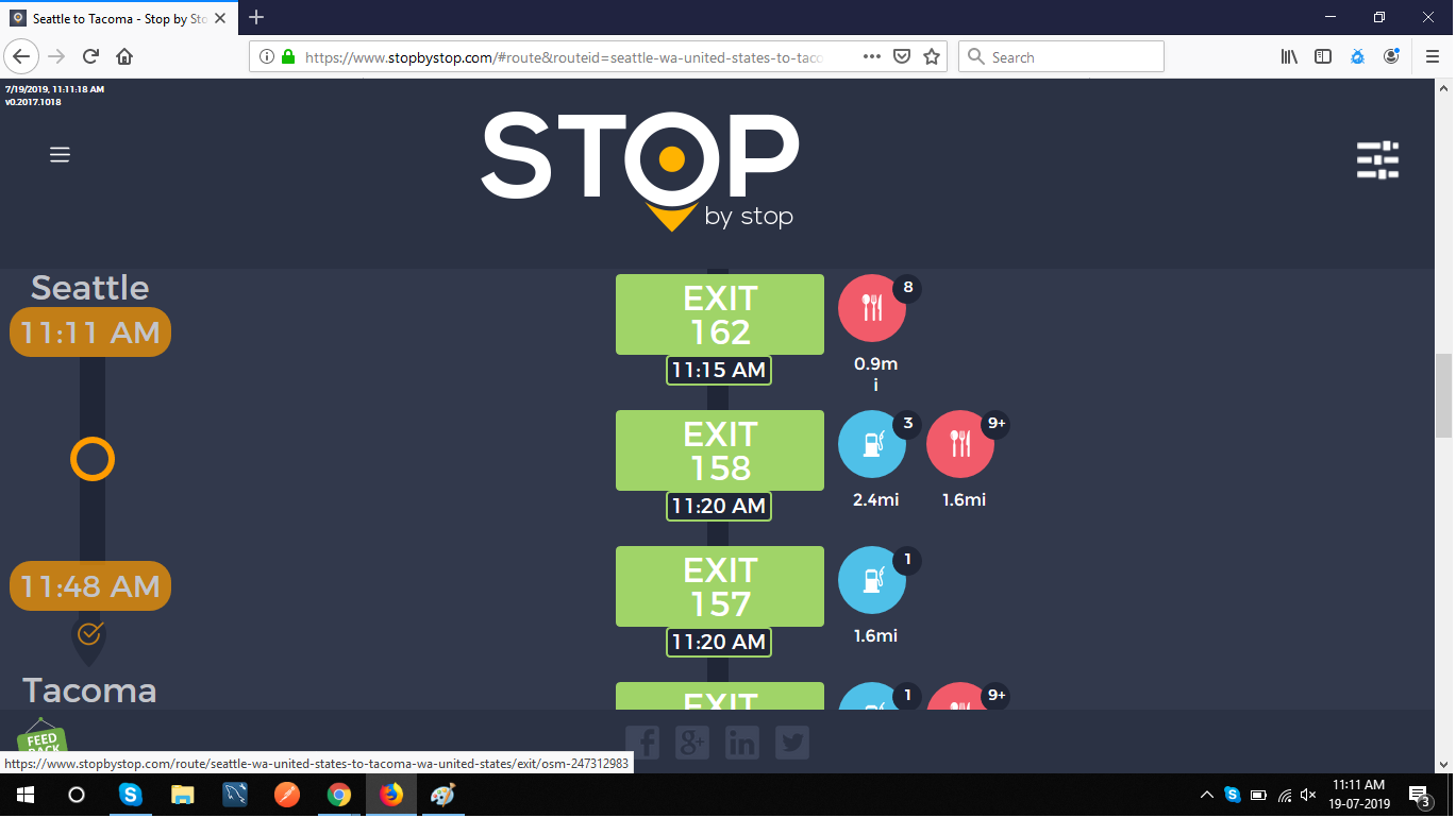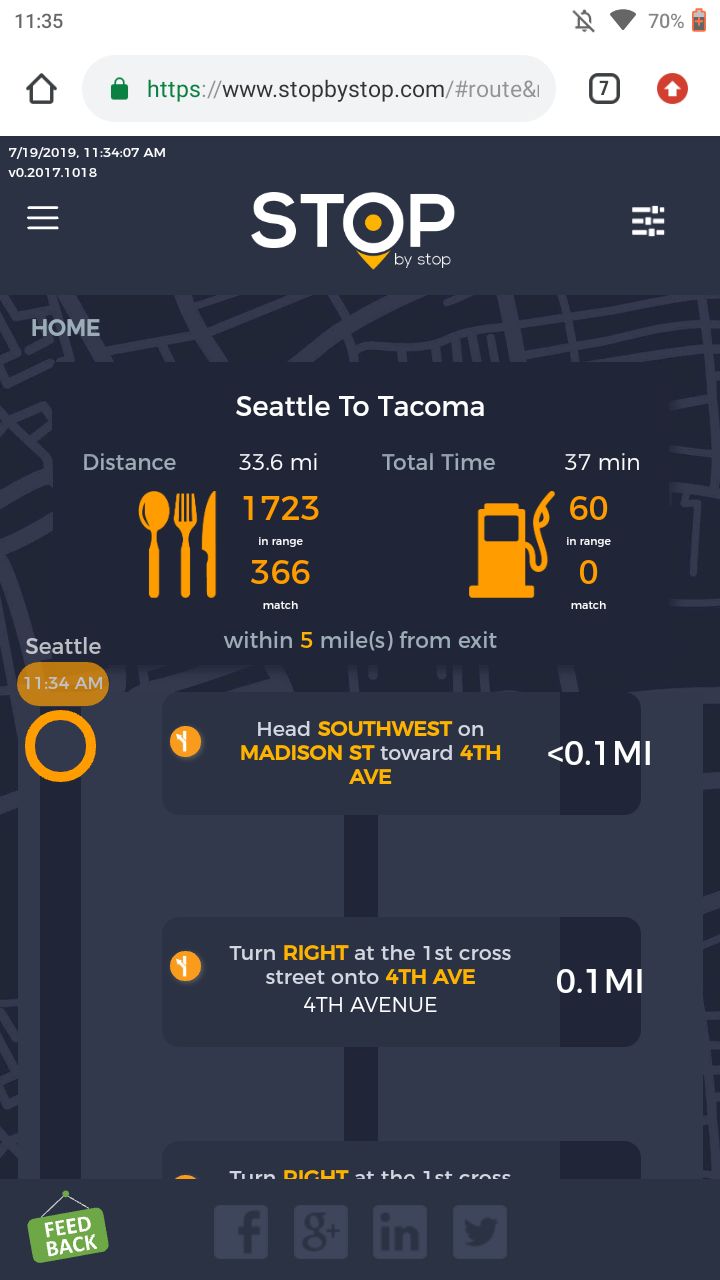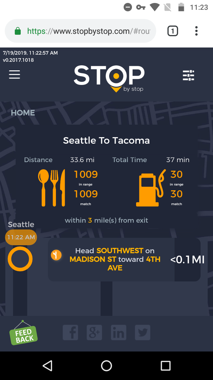 2. RoutePageRefesh. A. Navigate to test_server/ B. Type seat in the first textbox and pick Seattle from the dropdown. C. Type tac in the second textbox and pick Tacoma from the dropdown. D. Click View my trip. E. Route page should open showing exits with restaurants and gas station icons. F. Refresh the browser. Route page should open, NOT home page. Take screenshot. |