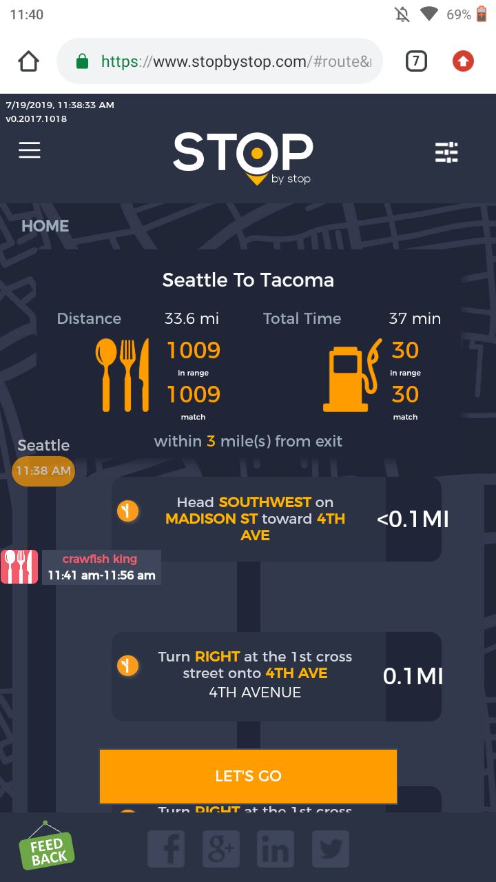 8. POISelectionGoToRoute. A. In the new browser tab open Seattle to Tacoma route. Click on first exit in the road line. Exit page should open. B. On the exit page click on the any item. POI page should open. </br/>C. On the POI page click Add to route button. POI selection popup should open. D. Click Add to route. Route page should open. E. On the sidebar there should be an icon to indicate the the place you picked. F. Click on Let's go button at the bottom of the screen. Google maps should open. Take a screenshot. |