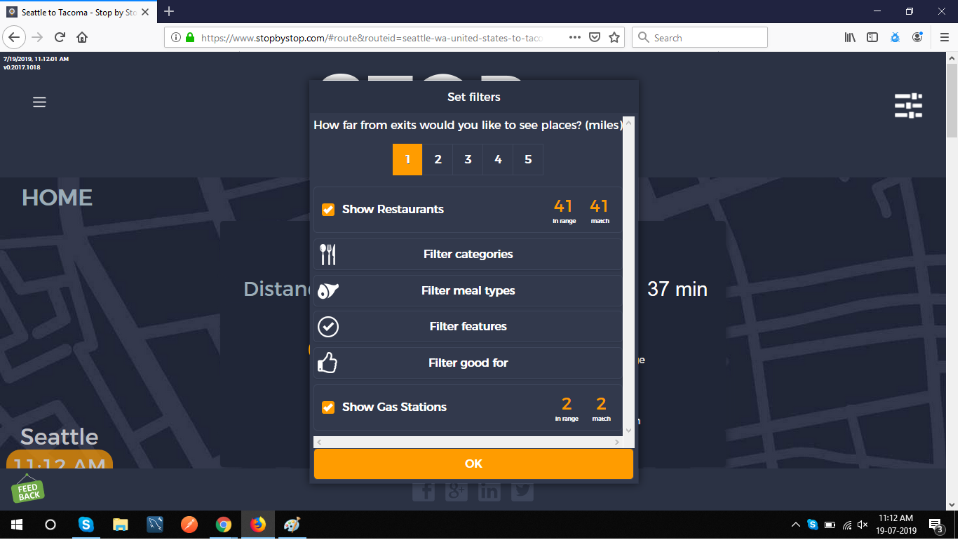 5. FiltersDistancePropagateToExit. A. Open Seattle to Tacoma route. B. Click on Filters and select 1 mile from exit. C. Close Filters popup and navigate to exit page. D. On the exit page open Filters popup and verify that distance settings (1 mile from exit) from route page are propagated. E. Take screenshot. |