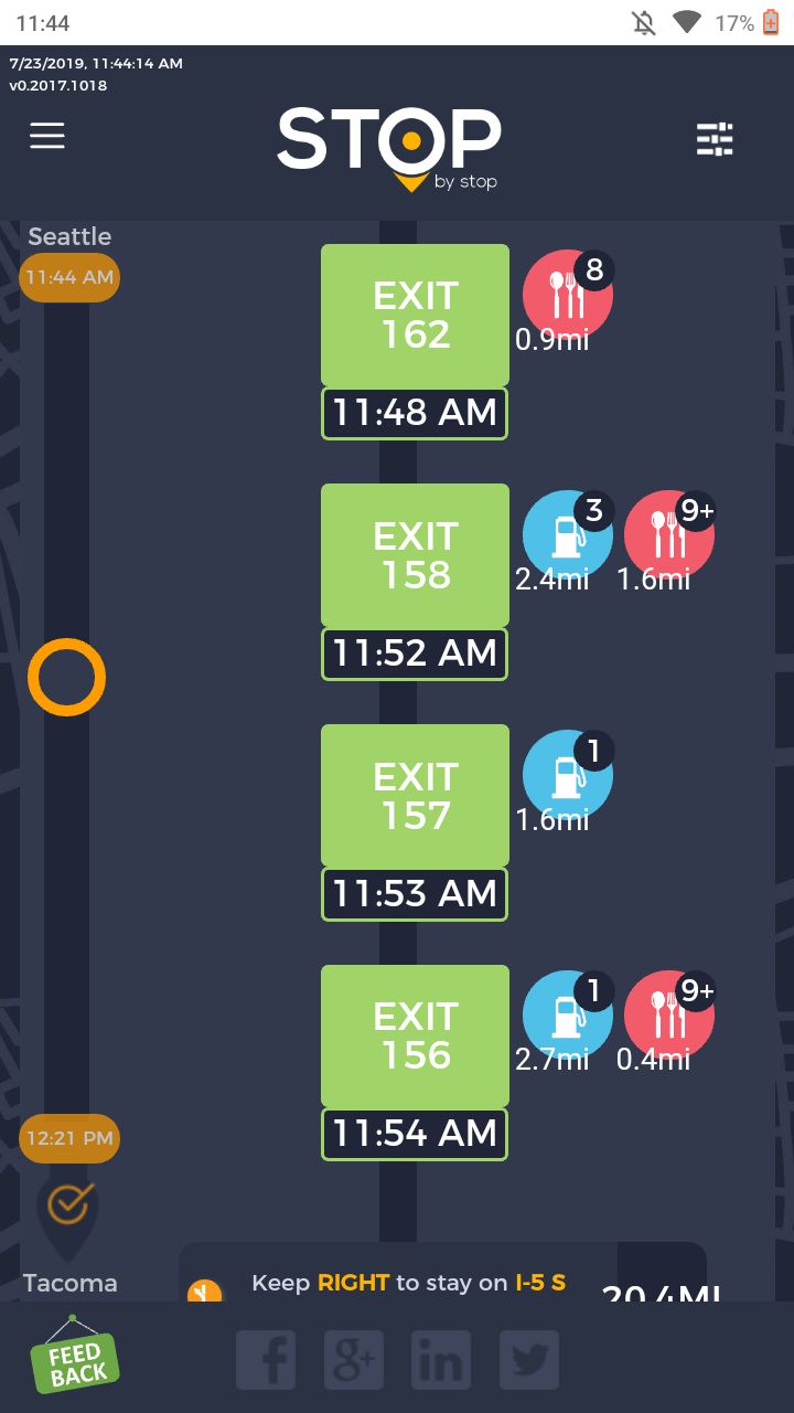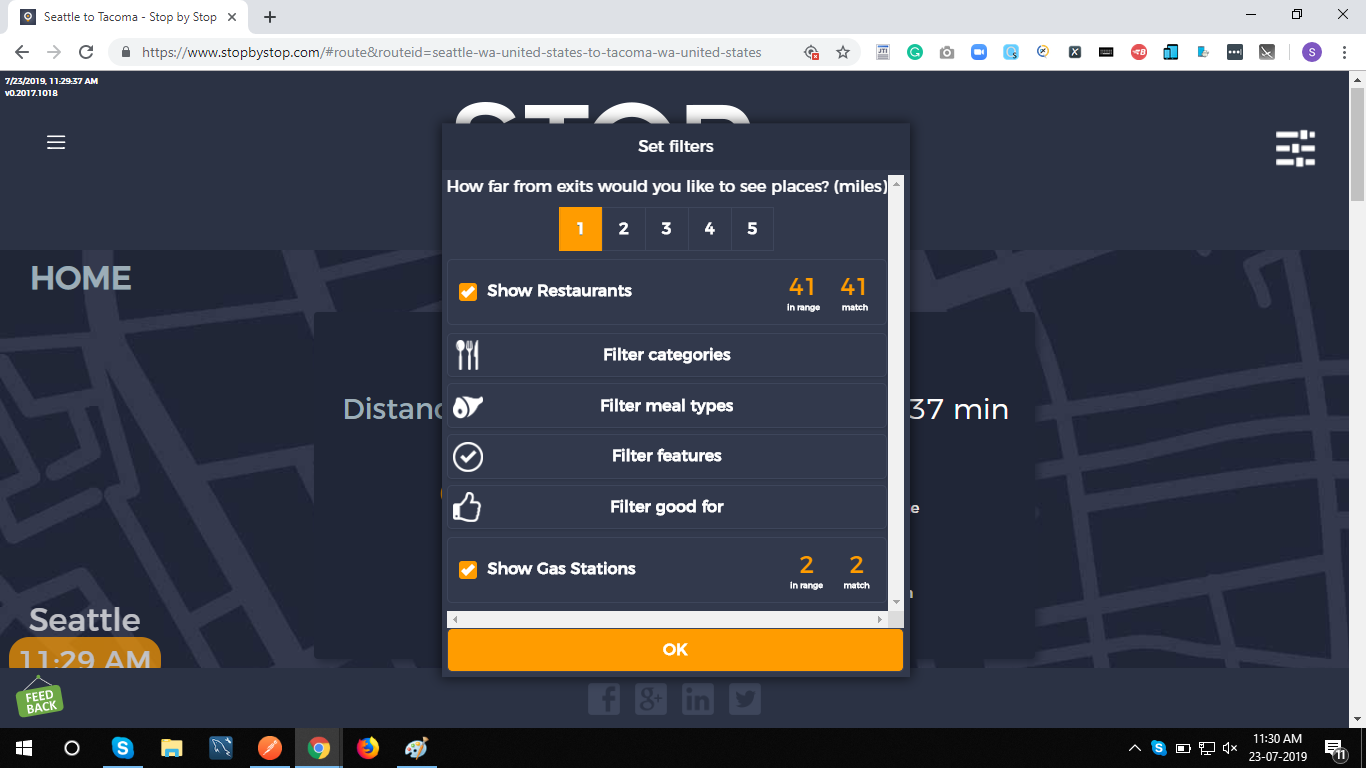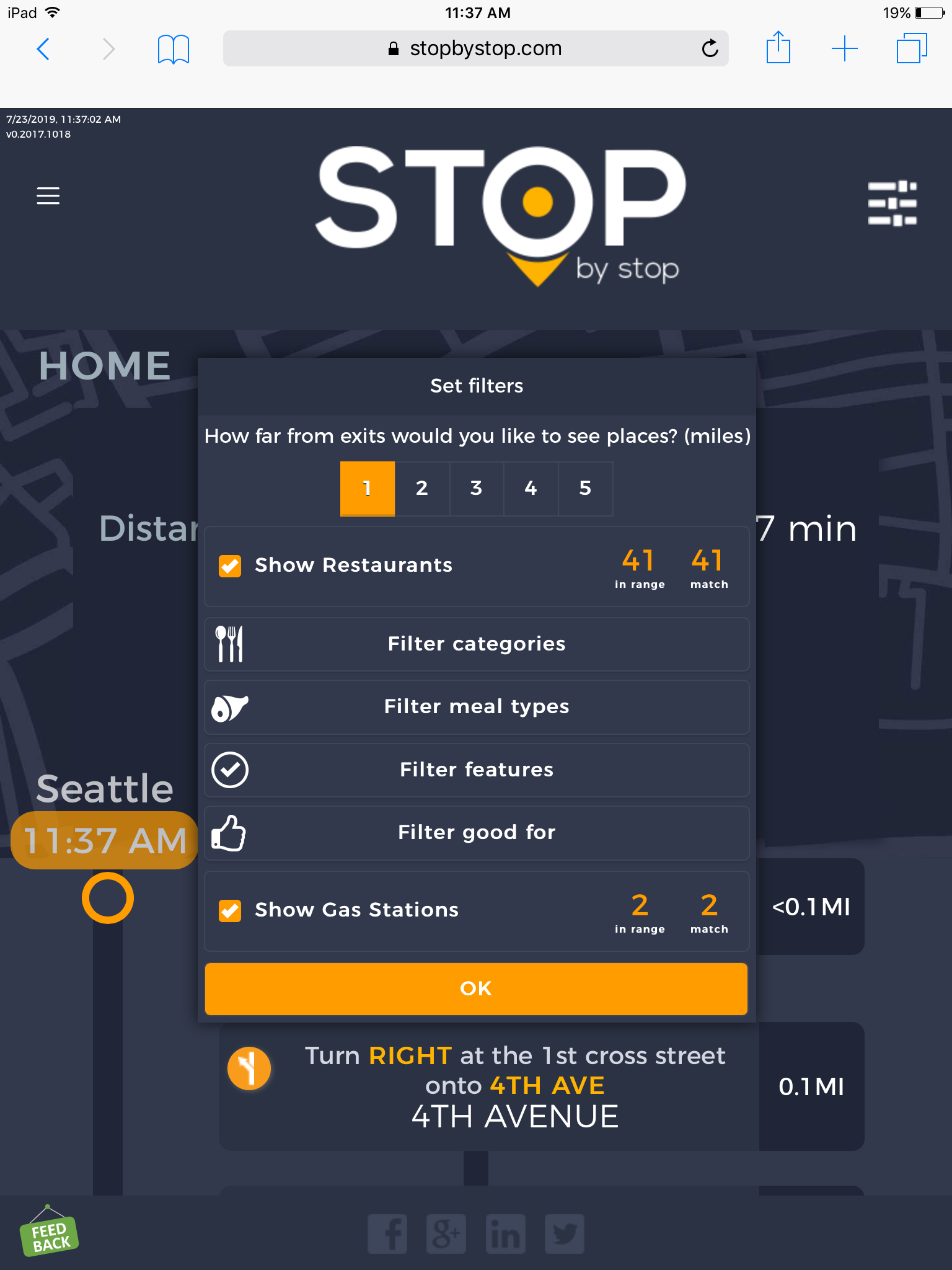 5. FiltersDistancePropagateToExit. A. Open Seattle to Tacoma route. B. Click on Filters and select 1 mile from exit. C. Close Filters popup and navigate to exit page. D. On the exit page open Filters popup and verify that distance settings (1 mile from exit) from route page are propagated. E. Take screenshot. |