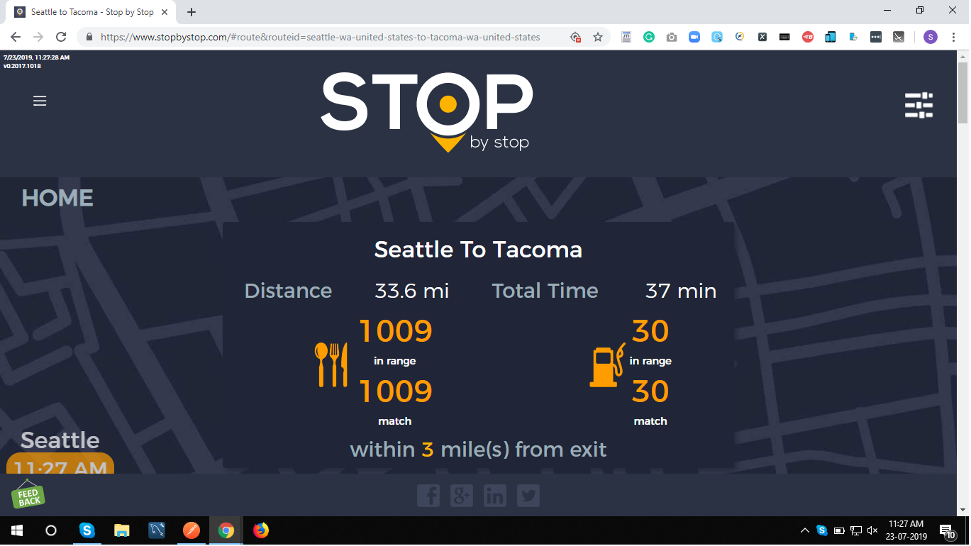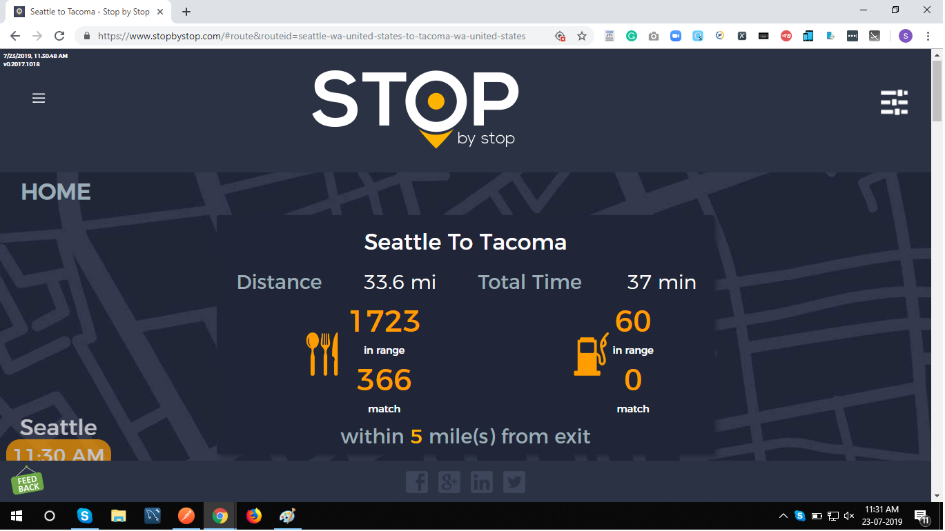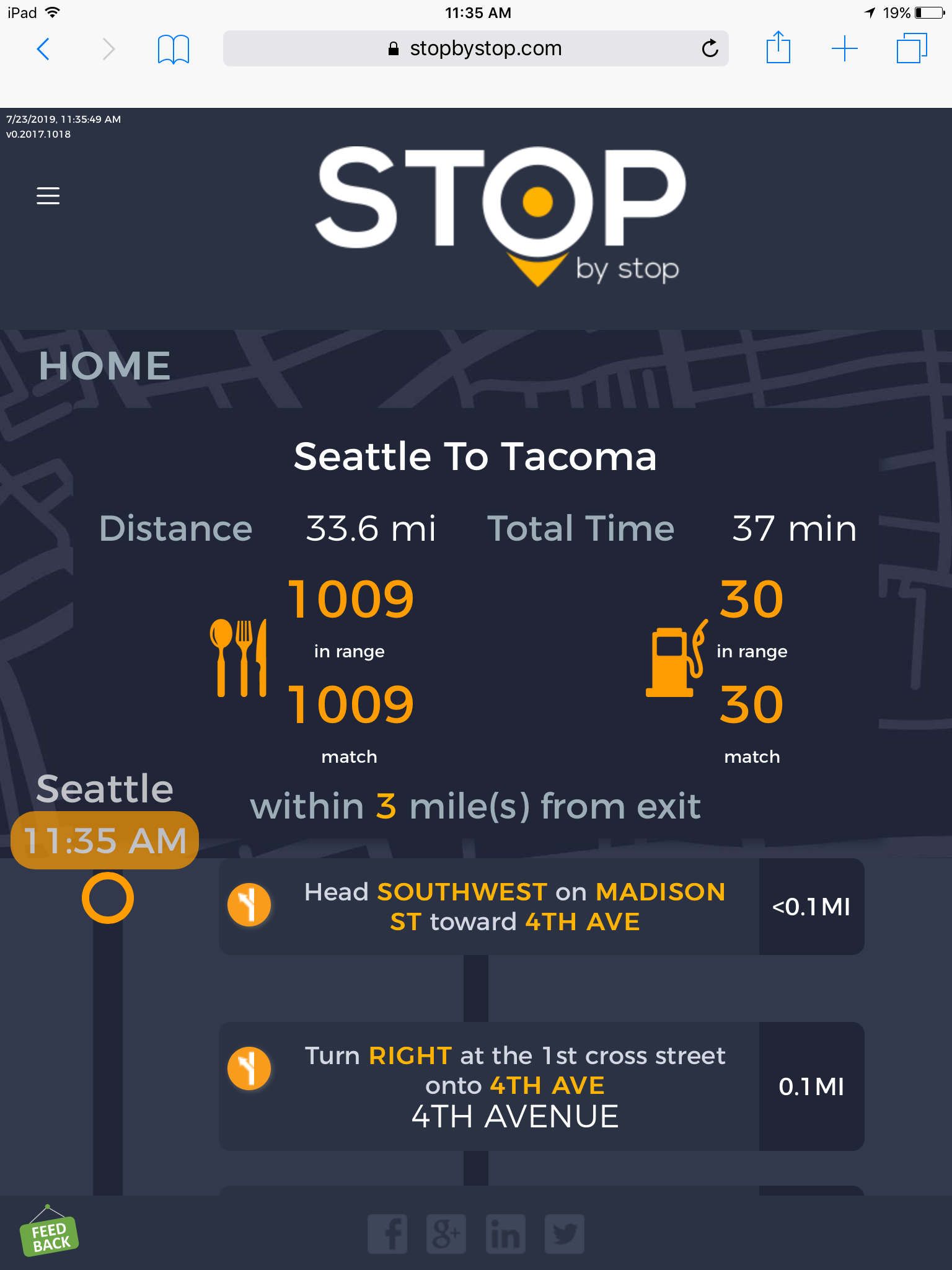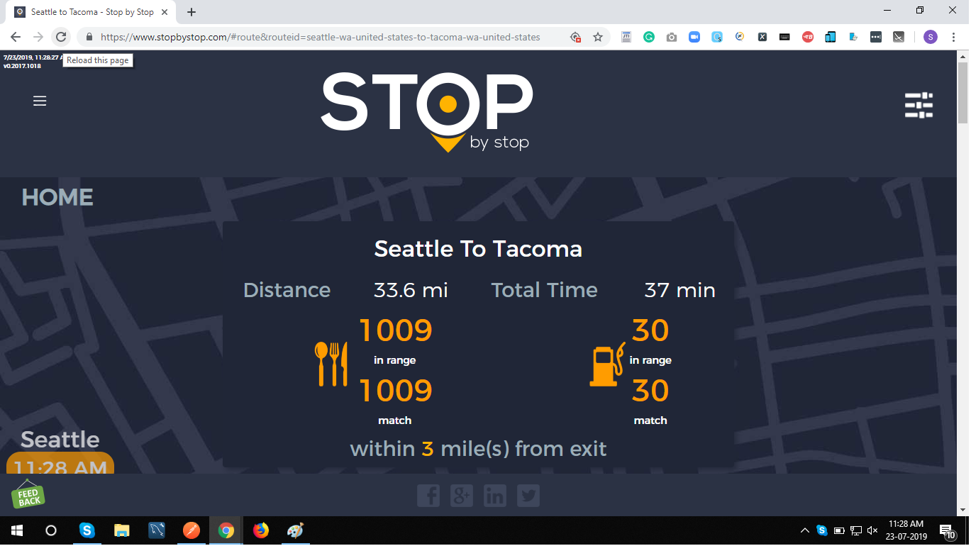 2. RoutePageRefesh. A. Navigate to test_server/ B. Type seat in the first textbox and pick Seattle from the dropdown. C. Type tac in the second textbox and pick Tacoma from the dropdown. D. Click View my trip. E. Route page should open showing exits with restaurants and gas station icons. F. Refresh the browser. Route page should open, NOT home page. Take screenshot. |