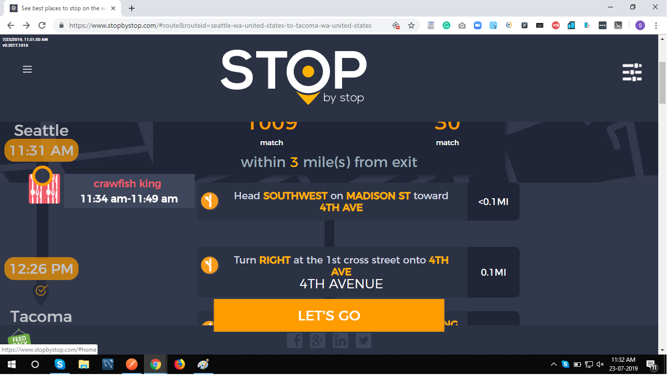 8. POISelectionGoToRoute. A. In the new browser tab open Seattle to Tacoma route. Click on first exit in the road line. Exit page should open. B. On the exit page click on the any item. POI page should open. </br/>C. On the POI page click Add to route button. POI selection popup should open. D. Click Add to route. Route page should open. E. On the sidebar there should be an icon to indicate the the place you picked. F. Click on Let's go button at the bottom of the screen. Google maps should open. Take a screenshot. |