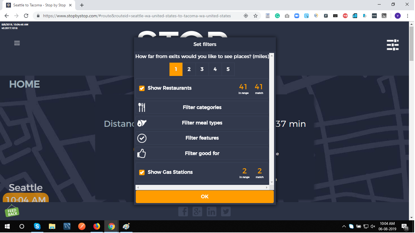 5. FiltersDistancePropagateToExit. A. Open Seattle to Tacoma route. B. Click on Filters and select 1 mile from exit. C. Close Filters popup and navigate to exit page. D. On the exit page open Filters popup and verify that distance settings (1 mile from exit) from route page are propagated. E. Take screenshot. |